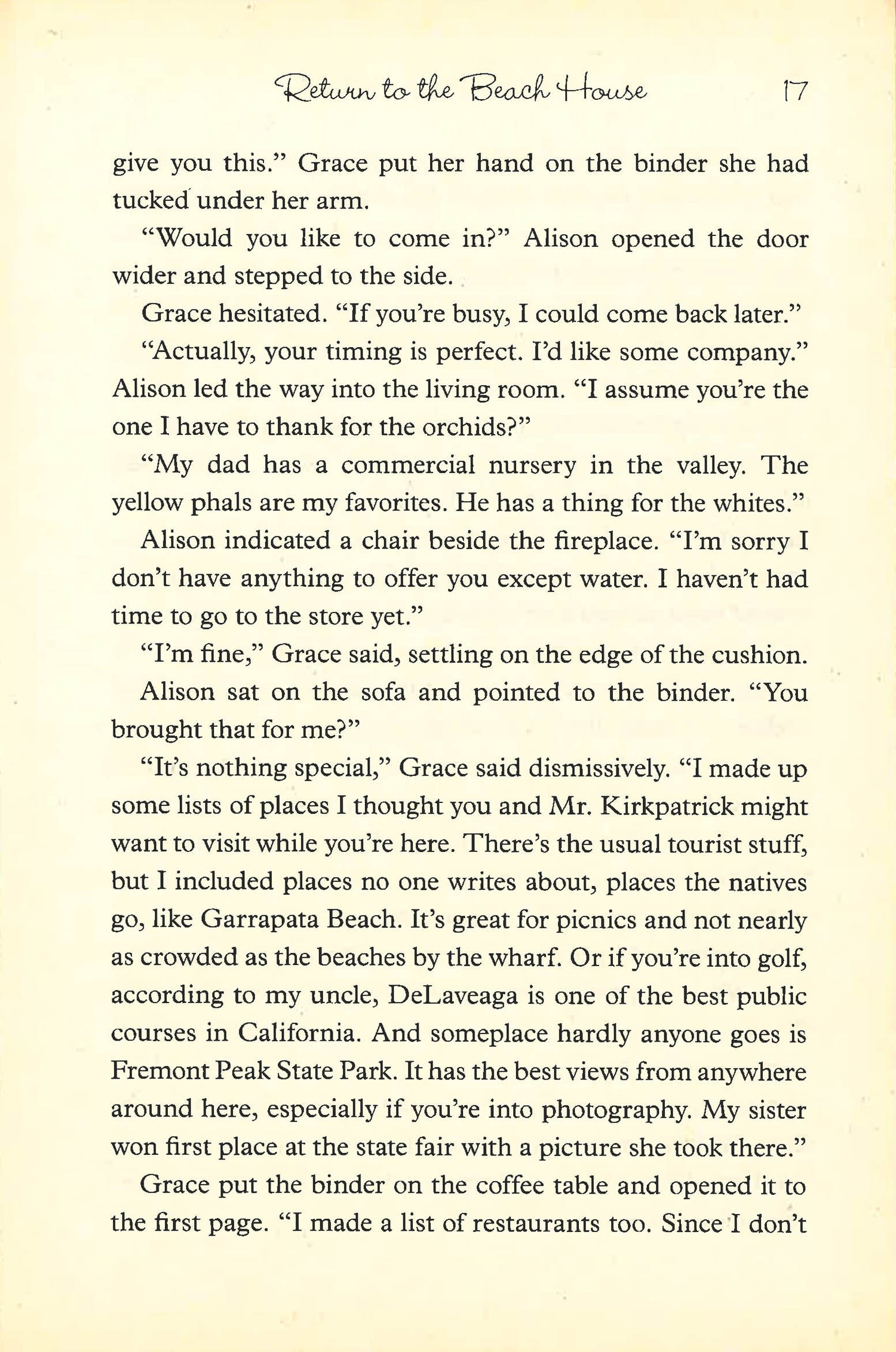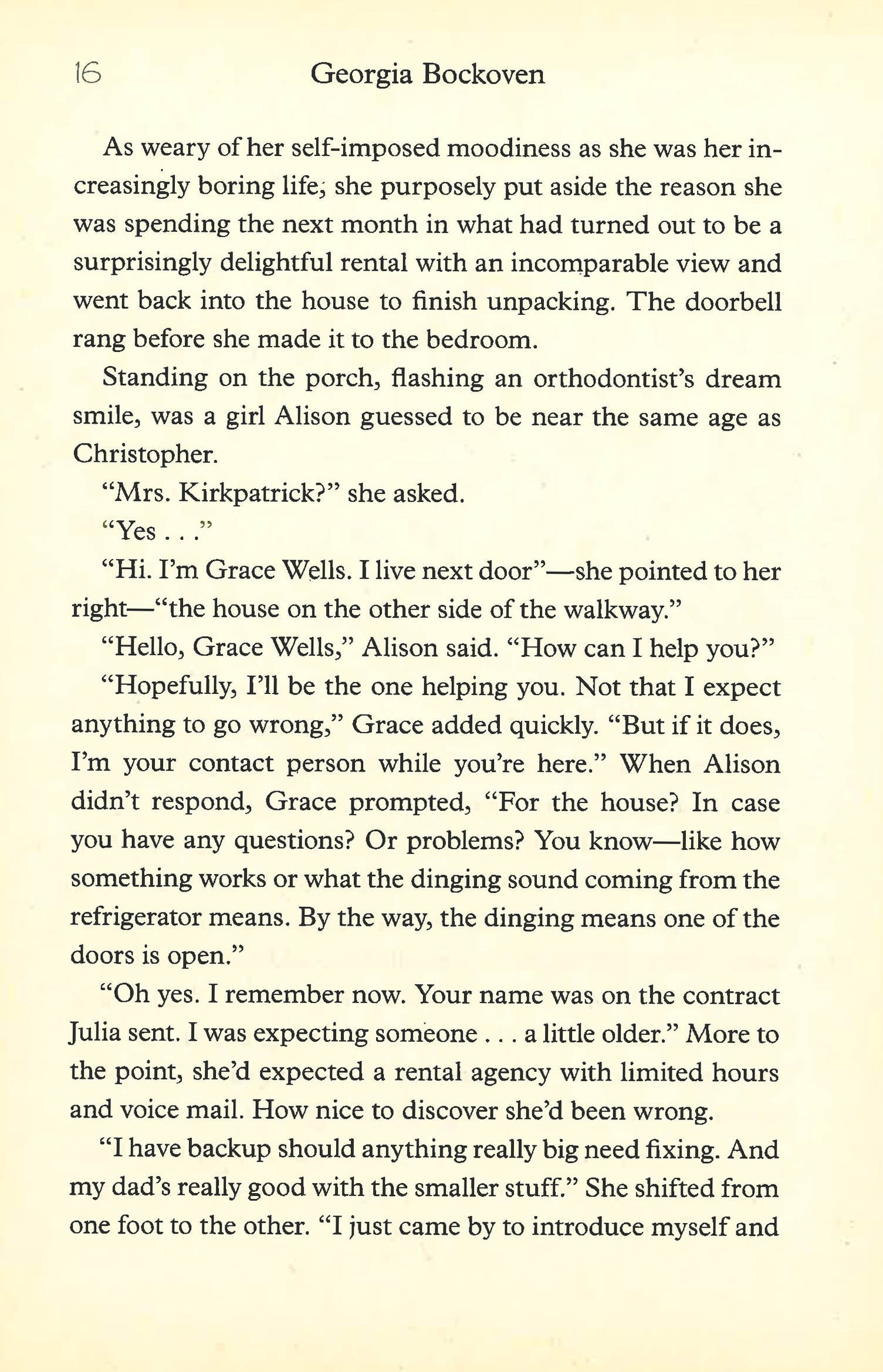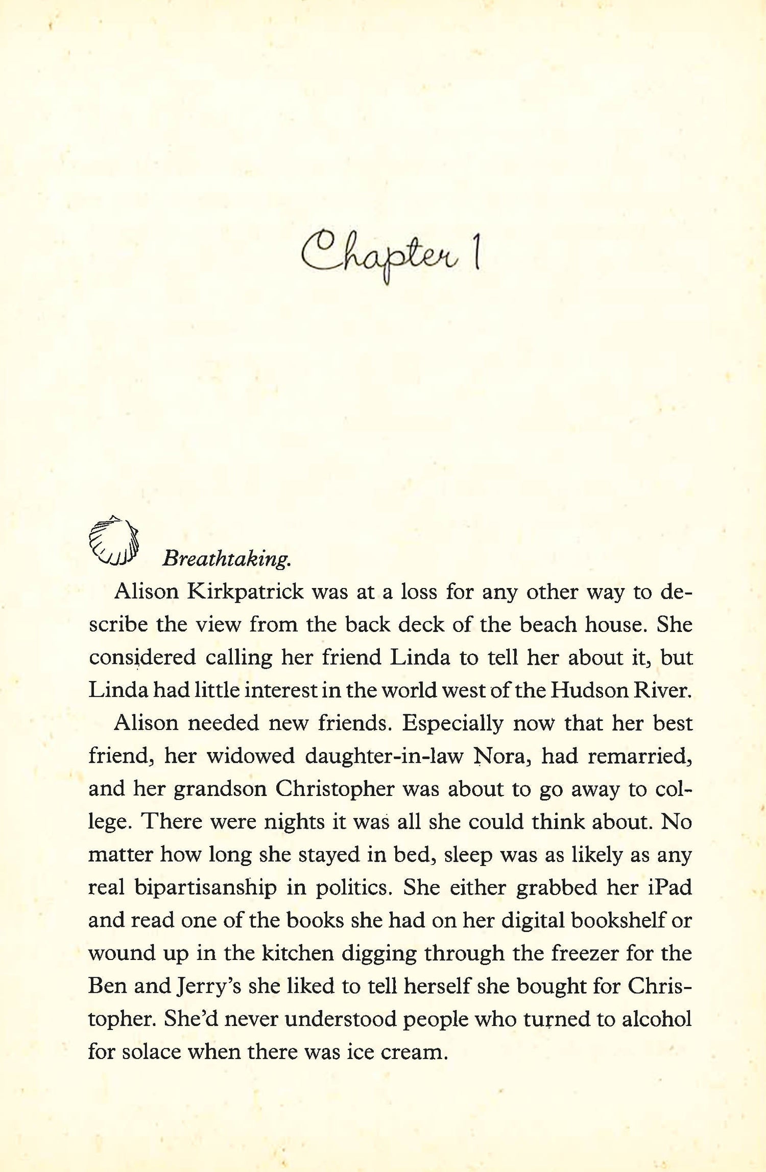 Alison arrives at the beach house in June to spend a month with her restless grandson before he leaves for his freshman year in college. Over a decade before, Alison lost her beloved husband, and has faced life alone ever since. Now she discovers a new life, and possible new love.