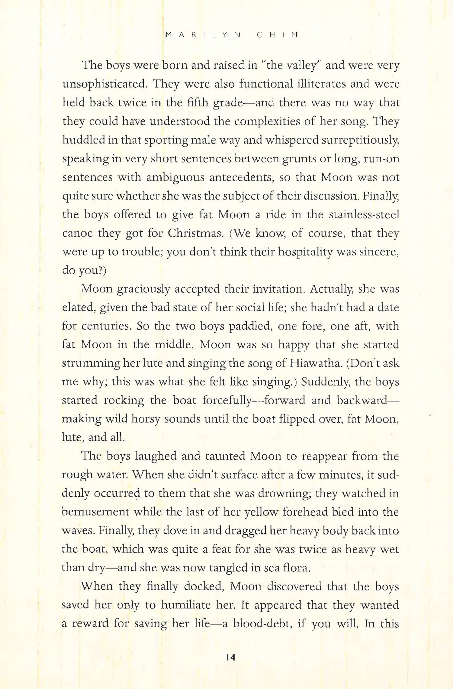 Raucous twin sisters Moonie and Mei Ling Wong are known as the "double happiness" Chinese food delivery girls. Each day they load up a "crappy donkey-van" and deliver Americanized ("bad") Chinese food to homes throughout their southern California neighborhood. United in their desire to blossom into somebodies, the Wong girls fearlessly assert their intellect and sexuality, even as they come of age under the care of their dominating, cleaver-wielding grandmother from Hong Kong. They transform themselves from food delivery girls into accomplished women, but along the way they wrestle with the influence and continuity of their Chinese heritage. Marilyn Chin's prose waxes and wanes between satire and metaphorical lyric, referencing classical Chinese tales and ghost stories that are at turns sensual, lurid, hilarious, shocking, and surreal.