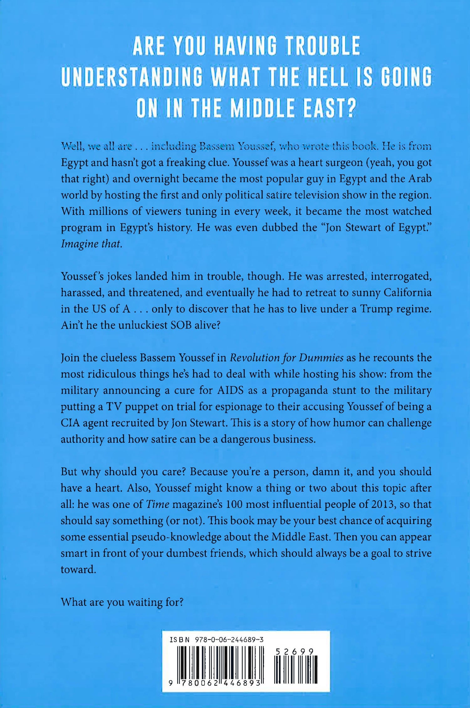 "Hilarious and Heartbreaking. Comedy shouldn't take courage, but it made an exception for Bassem." --Jon Stewart "The Jon Stewart of the Arabic World"-the creator of The Program, the most popular television show in Egypt's history-chronicles his transformation from heart surgeon to political satirist, and offers crucial insight into the Arab Spring, the Egyptian Revolution, and the turmoil roiling the modern Middle East, all of which inspired the documentary about his life, Tickling Giants. Bassem Youssef's incendiary satirical news program, Al-Bernameg (The Program), chronicled the events of the 2011 Egyptian Revolution, the fall of President Hosni Mubarak, and the rise of Mubarak's successor, Mohamed Morsi. Youssef not only captured his nation's dissent but stamped it with his own brand of humorous political criticism, in which the Egyptian government became the prime laughing stock. So potent were Youssef's skits, jokes, and commentary, the authoritarian government accused him of insulting the Egyptian presidency and Islam. After a six-hour long police interrogation, Youssef was released. While his case was eventually dismissed, his television show was terminated, and Youssef, fearful for his safety, fled his homeland. In Revolution for Dummies, Youssef recounts his life and offers hysterical riffs on the hypocrisy, instability, and corruption that has long animated Egyptian politics. From the attempted cover-up of the violent clashes in Tahrir Square to the government's announcement that it had created the world's first "AIDS cure" machine, to the conviction of officials that Youssef was a CIA operative-recruited by Jon Stewart-to bring down the country through sarcasm. There's much more-and it's all insanely true. Interweaving the dramatic and inspiring stories of the development of his popular television show and his rise as the most contentious funny-man in Egypt, Youssef's humorous, fast-paced takes on dictatorship, revolution, and the unforeseeable destiny of democracy in the Modern Middle East offers much needed hope and more than a few healing laughs. A documentary about his life, Tickling Giants, debuted at the Tribeca Film Festival in 2016, and is now scheduled for major release.