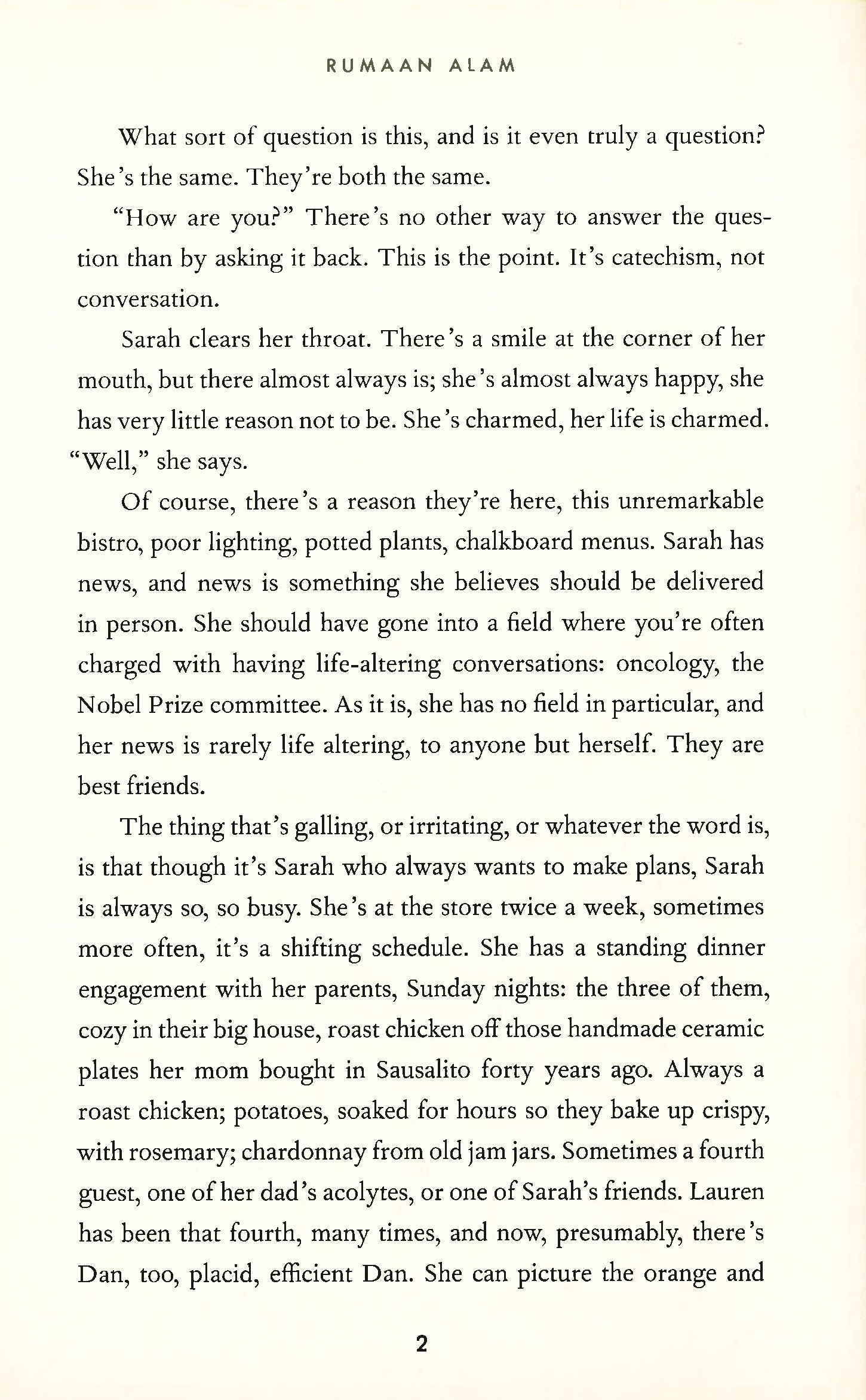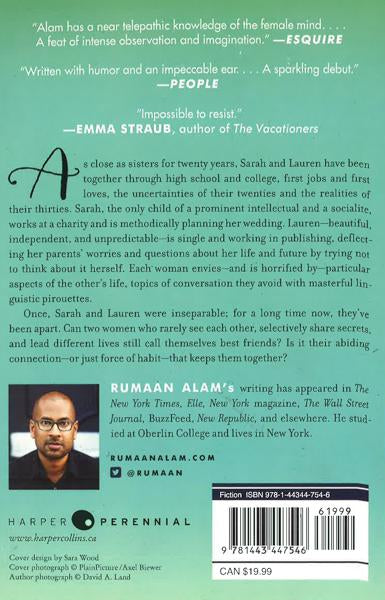 As close as sisters for twenty years, Sarah and Lauren have been together through high school and college, first jobs and first loves, the uncertainties of their twenties and the realities of their thirties.Sarah, the only child of a prominent intellectual and a socialite, works at a charity and is methodically planning her wedding. Lauren - beautiful, independent, and unpredictable - is single and working in publishing, deflecting her parents’ worries and questions about her life and future by trying not to think about it herself. Each woman envies - and is horrified by - particular aspects of the other’s life, topics of conversation they avoid with masterful linguistic pirouettes.Once, Sarah and Lauren were inseparable; for a long a time now, they’ve been apart. Can two women who rarely see one other, selectively share secrets, and lead different lives still call themselves best friends? Is it their abiding connection - or just force of habit - that keeps them together?With impeccable style, biting humor, and a keen sense of detail, Rumaan Alam deftly explores how the attachments we form in childhood shift as we adapt to our adult lives - and how the bonds of friendship endure, even when our paths diverge.