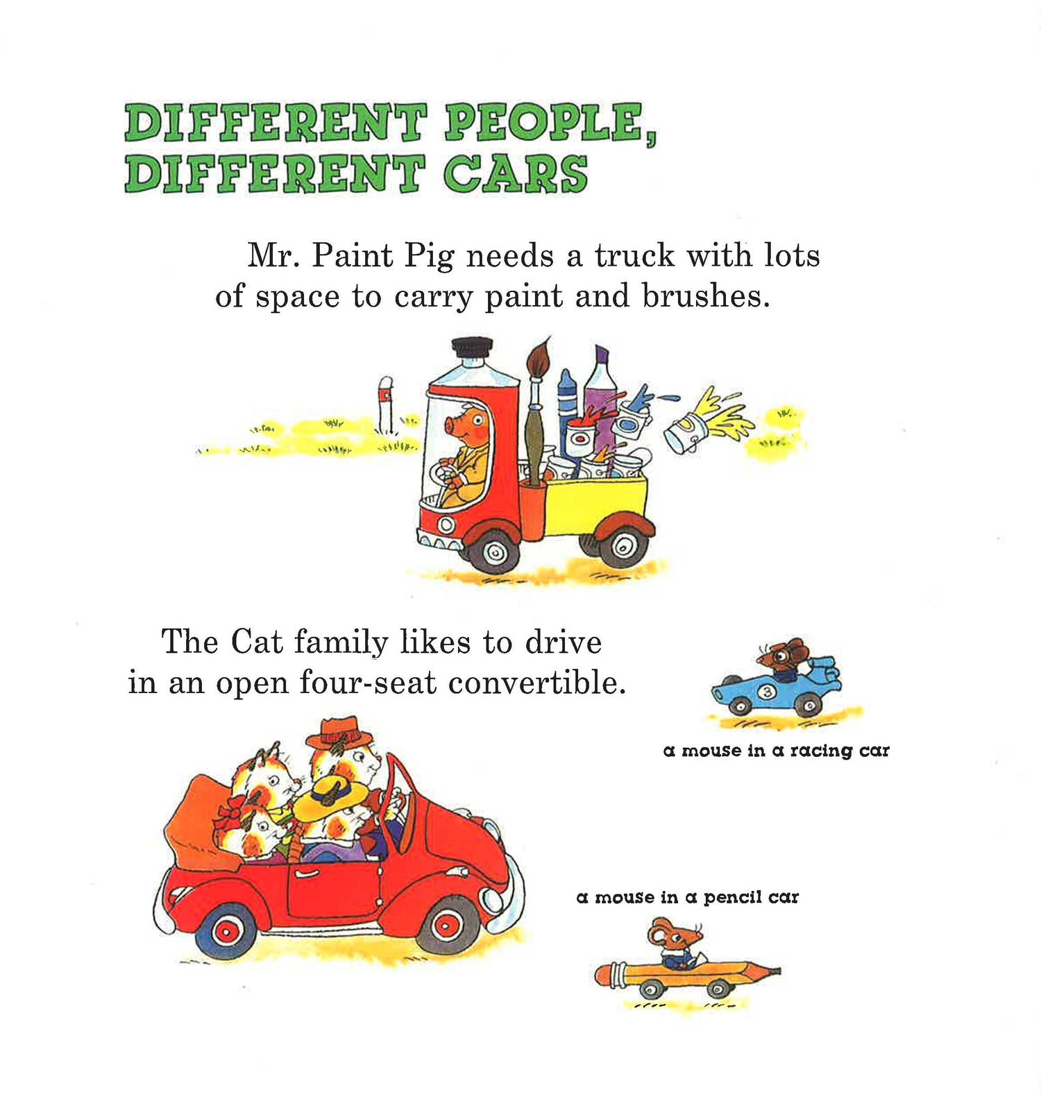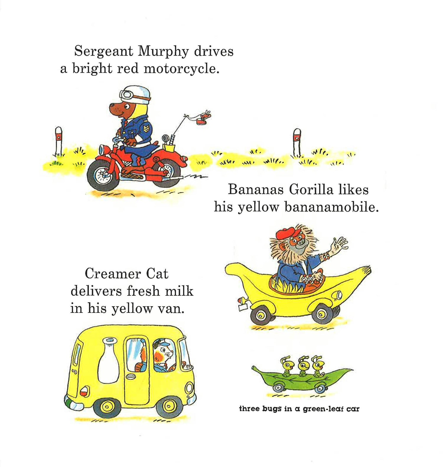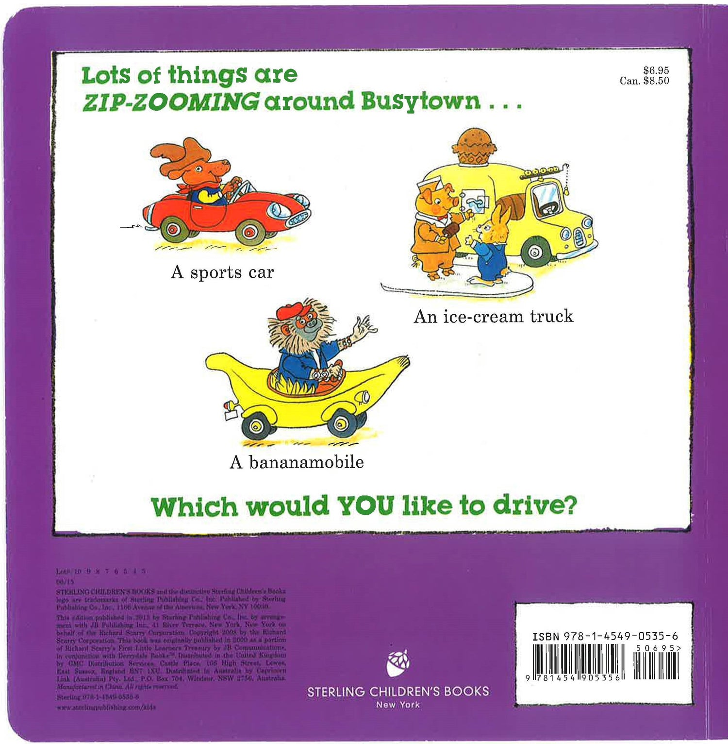 Children will love these colourful cars, trucks and cycles, including a bananamobile and 'bugdozer'. It is suitable for children aged 3 to 5 years old. Beep, beep! Honk, honk! Busytown's residents are on the go! Richard Scarry's wacky introduction to vehicles both realistic and fanciful brims with his trademark humour. Every one of these colourful cars, trucks and cycles, from the Cat family's bright red convertible and Postman Pig's mail van to Banana Gorilla's yellow bananamobile, Wilbur Rabbit's drivable hot dog and Lowly Worm's bugdozer-will delight car-loving children.