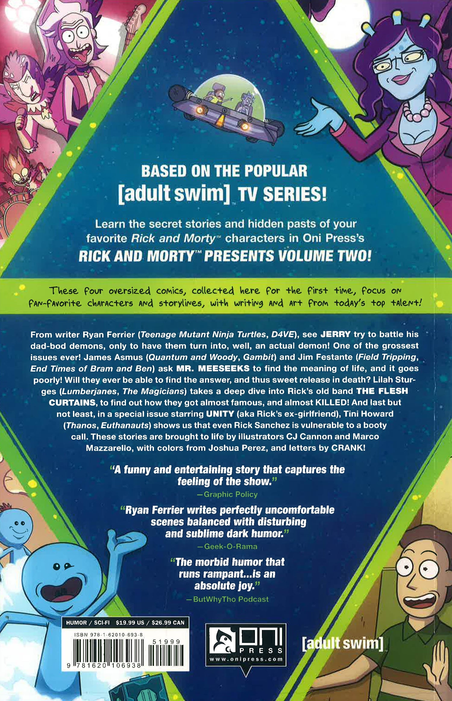 Learn even more of the secret stories and hidden pasts of your favorite Rick and Morty(TM) characters. A frightful tale about everyone's favorite(ital) character: Jerry! What happens when you ask Mr. Meeseeks to discovery the meaning of life? Nothing good! Plus: the "behind the music" style secrets of The Flesh Curtains, Rick's band! And don't miss a story centered on Unity, Rick's favorite ex-girlfriend. Why does she need him to take over the Galaxy? You'll have to read to find out... Stories from today's top writers including Tini Howard (Thanos, Euthanauts), Ryan Ferrier (D4ve, Narcos), Lilah Sturges (Lumberjanes), and James Asmus (Quantum and Woody) and Jim Festante; with art by C.J. Cannon with Joshua Perez!