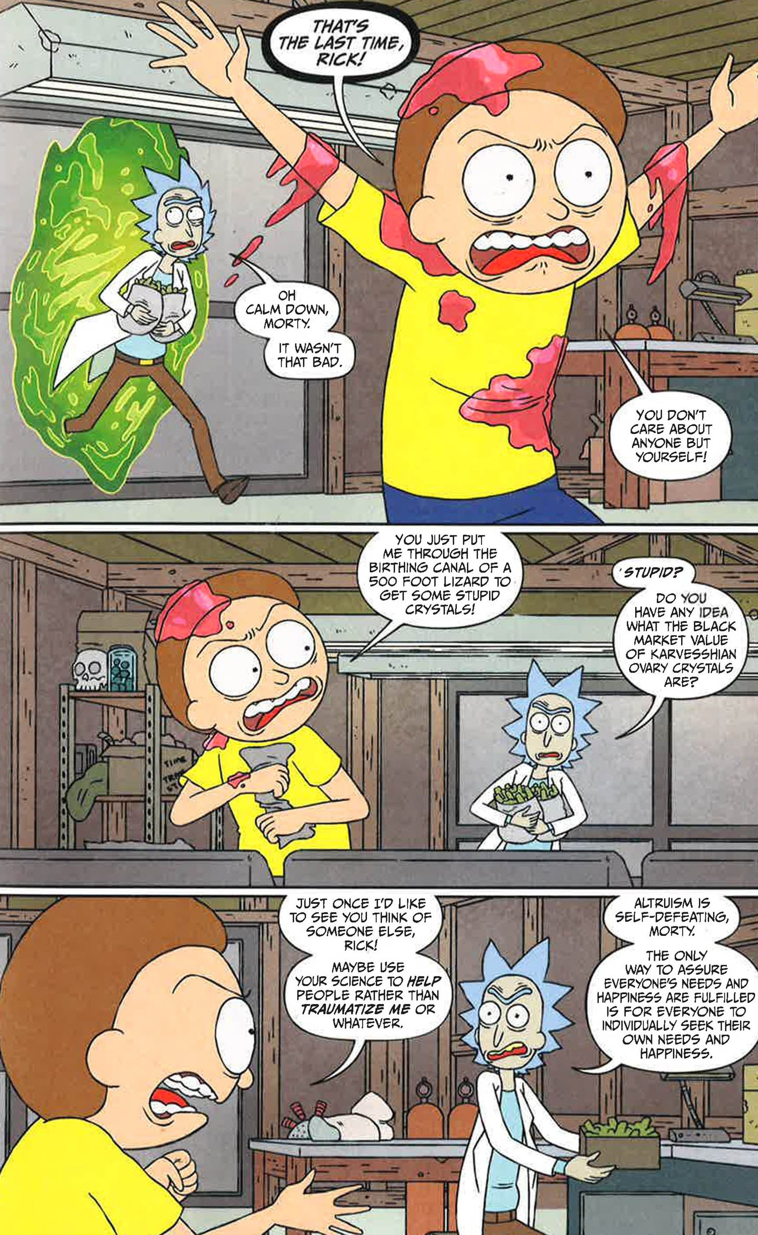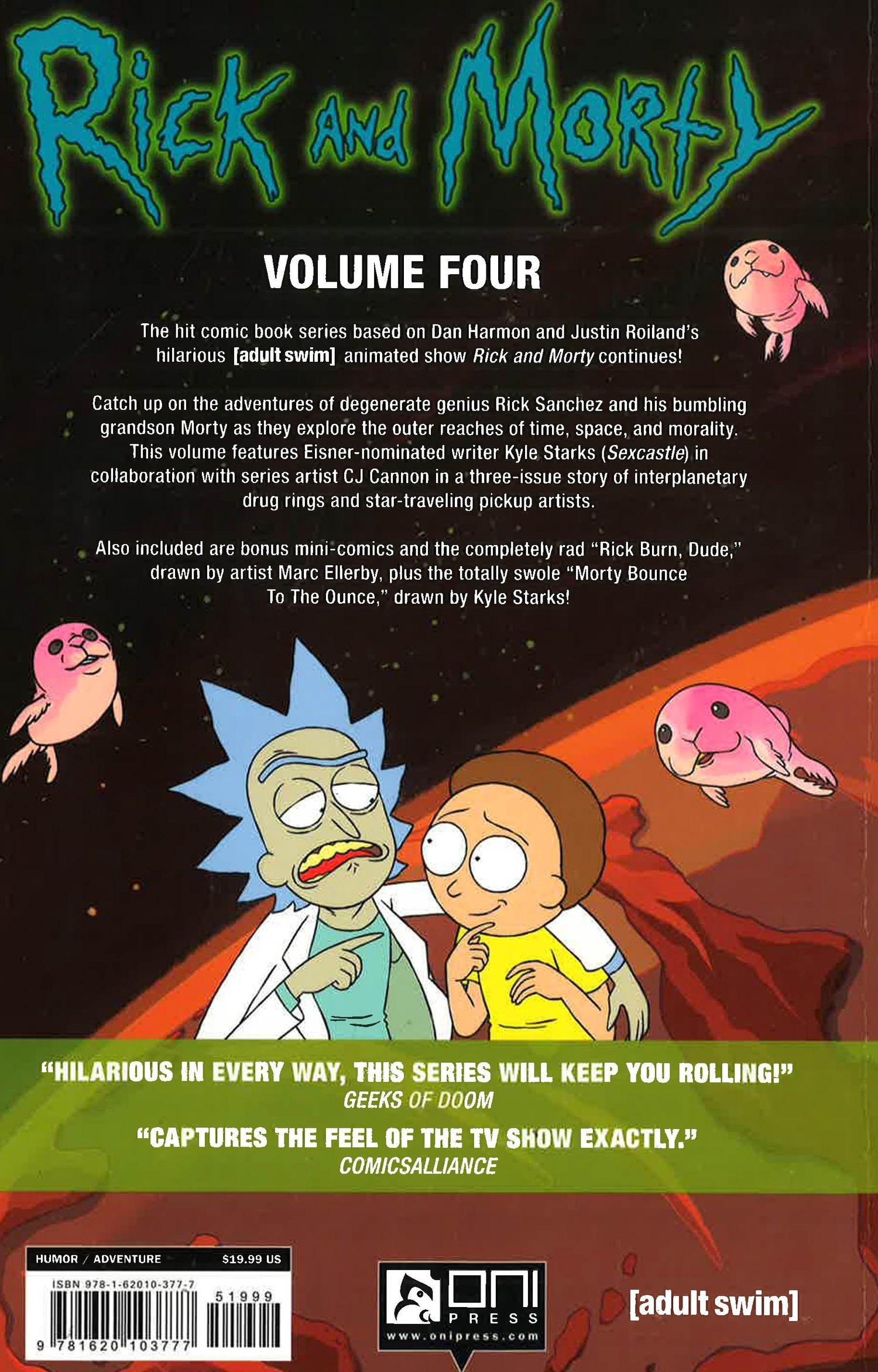 The hit comic book series based on Dan Harmon and Justin Roiland's hilarious [Adult Swim] animated show RICK & MORTY continues! Catch up on the adventures of degenerate genius Rick Sanchez and his bumbling grandson Morty as they explore the outer reaches of time, space, and morality. This volume features Eisner award nominated writer Kyle Starks (SEXCASTLE) in collaboration with series artist CJ Cannon in a three-issue story of interplanetary drug rings and star-traveling pickup artists. Also included is Rick Burn, Dude, drawn by artist Marc Ellerby, in which Rick and Morty take a germaphobic planet by storm, a totally swole one-shot drawn by Kyle Starks, and hilarious backup comics about the whole family!
