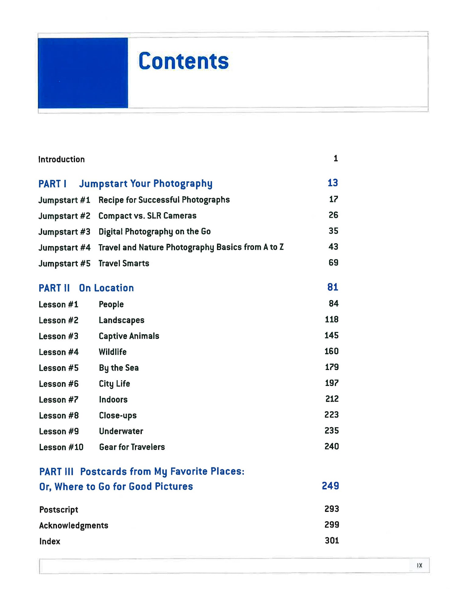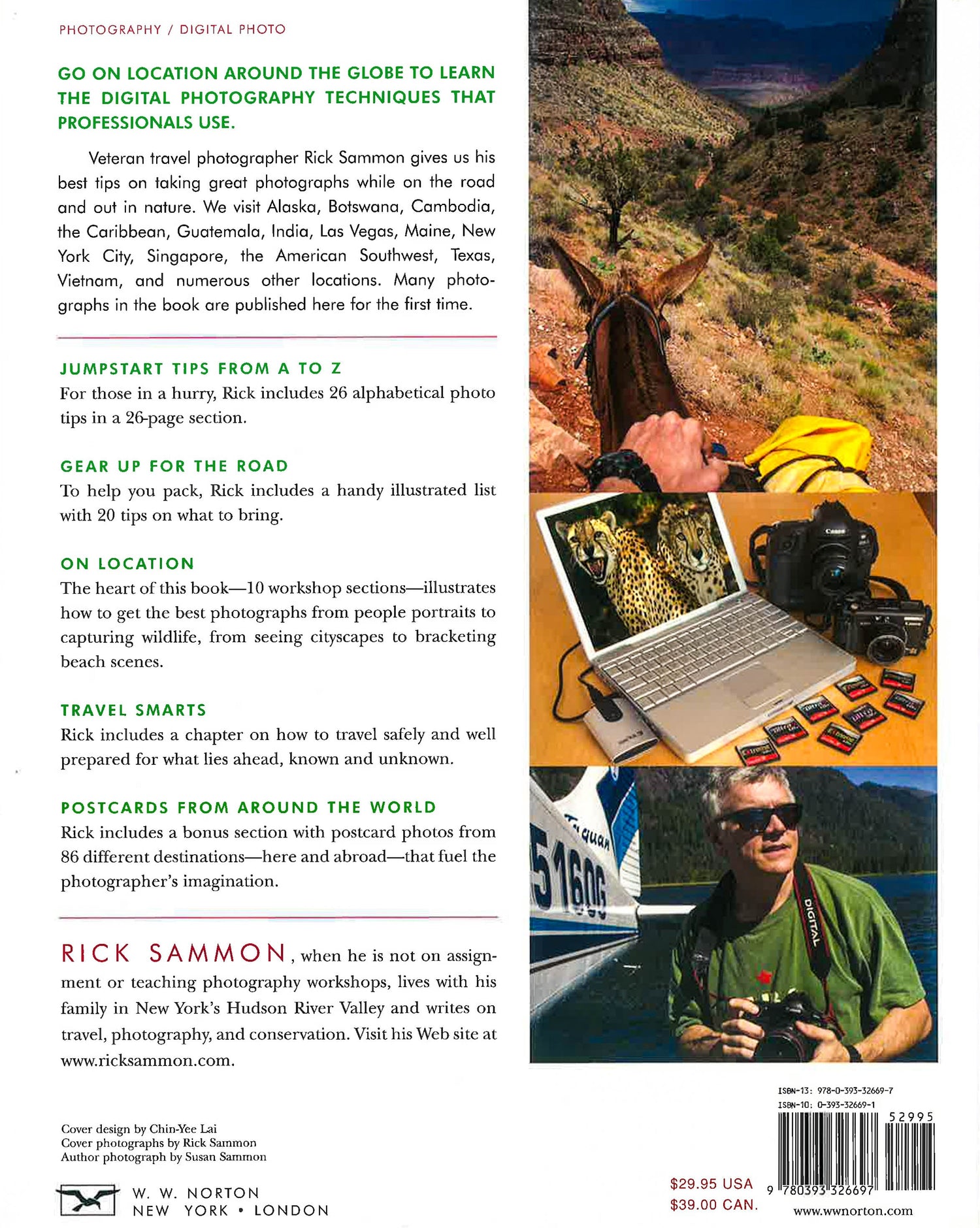 Whether traveling with family or friends, for pleasure or for business, more of us tote cameras along than ever before. Rick Sammon guides us through dozens of different shooting situations from action shots to portraits, from aerials to zoos, from low light to bright light, from landscape to cityscape, from close-up to panorama, from silhouettes to sense of depth. The book features how-to tips from a photographer who has traveled to over fifty countries, from photographing seals under the ice in Siberia's Lake Baikal to monarch butterflies on Mexican mountaintops. Sammon's thematically organized excursions take the reader to Vietnam, Kampuchea, Guatemala, India, Alaska, Singapore, Maine, Texas, New York City, Las Vegas, Botswana, the Caribbean, and the American Southwest, among many other locations.