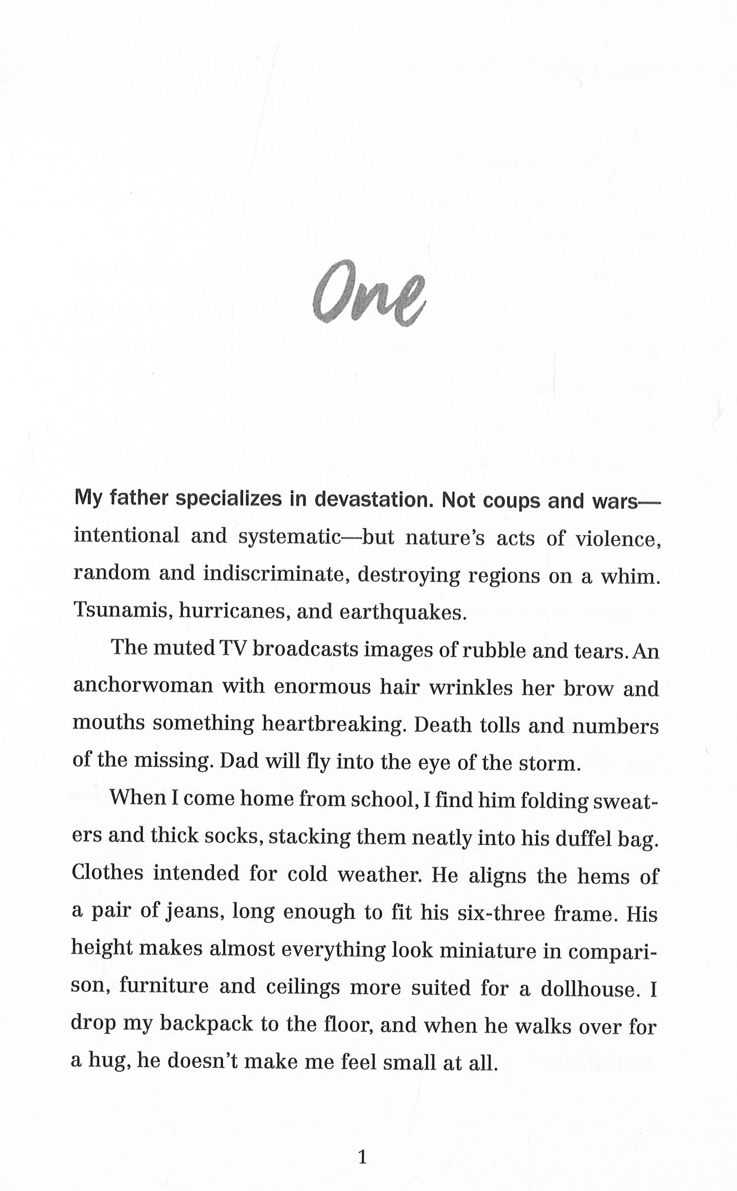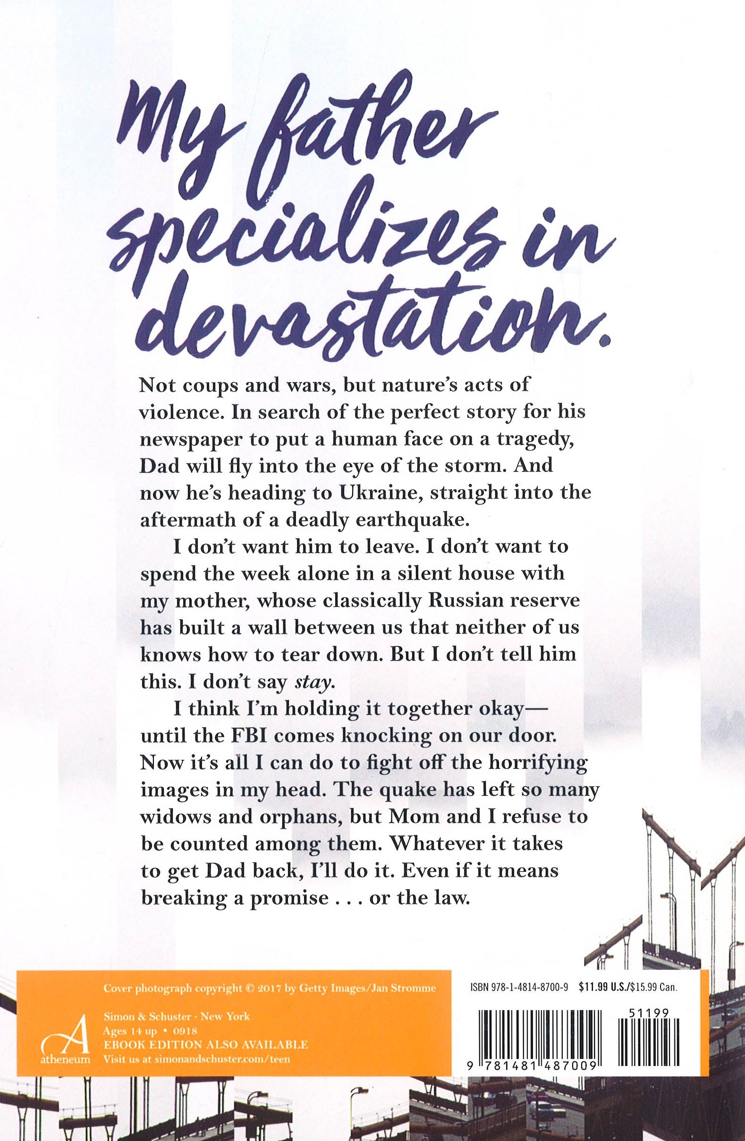 In search of the perfect story to put a human face on a tragedy, Charlotte’s reporter dad will fly into the eye of a storm. And now he’s heading to Ukraine, straight into the aftermath of a deadly earthquake. Charlotte doesn’t want him to leave. She doesn’t want to spend the week alone in a silent house with her mother, whose classically Russian reserve has built a wall between them that neither knows how to tear down. Charlotte is holding it together okay - until the FBI comes knocking on her door. Her father has been taken hostage! The quake has left so many orphans and widows, but Charlotte refuses to be counted among them. Whatever it takes to get her dad back, she’ll do it. Even if it means breaking a promise . . . or the law.