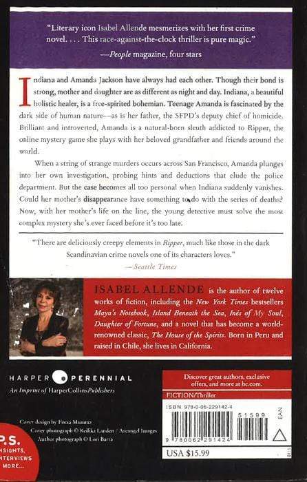 Isabel Allende--the New York Times bestselling author whose books, including Maya's Notebook, Island Beneath the Sea, and Zorro, have sold more than 57 million copies around the world--demonstrates her remarkable literary versatility with Ripper, an atmospheric, fast-paced mystery involving a brilliant teenage sleuth who must unmask a serial killer in San Francisco. The Jackson women, Indiana and Amanda, have always had each other. Yet, while their bond is strong, mother and daughter are as different as night and day. Indiana, a beautiful holistic healer, is a free-spirited bohemian. Long divorced from Amanda's father, she's reluctant to settle down with either of the men who want her--Alan, the wealthy scion of one of San Francisco's elite families, and Ryan, an enigmatic, scarred former Navy SEAL. While her mom looks for the good in people, Amanda is fascinated by the dark side of human nature, like her father, the SFPD's Deputy Chief of Homicide. Brilliant and introverted, the MIT-bound high school senior is a natural-born sleuth addicted to crime novels and Ripper, the online mystery game she plays with her beloved grandfather and friends around the world. When a string of strange murders occurs across the city, Amanda plunges into her own investigation, discovering, before the police do, that the deaths may be connected. But the case becomes all too personal when Indiana suddenly vanishes. Could her mother's disappearance be linked to the serial killer? Now, with her mother's life on the line, the young detective must solve the most complex mystery she's ever faced before it's too late.