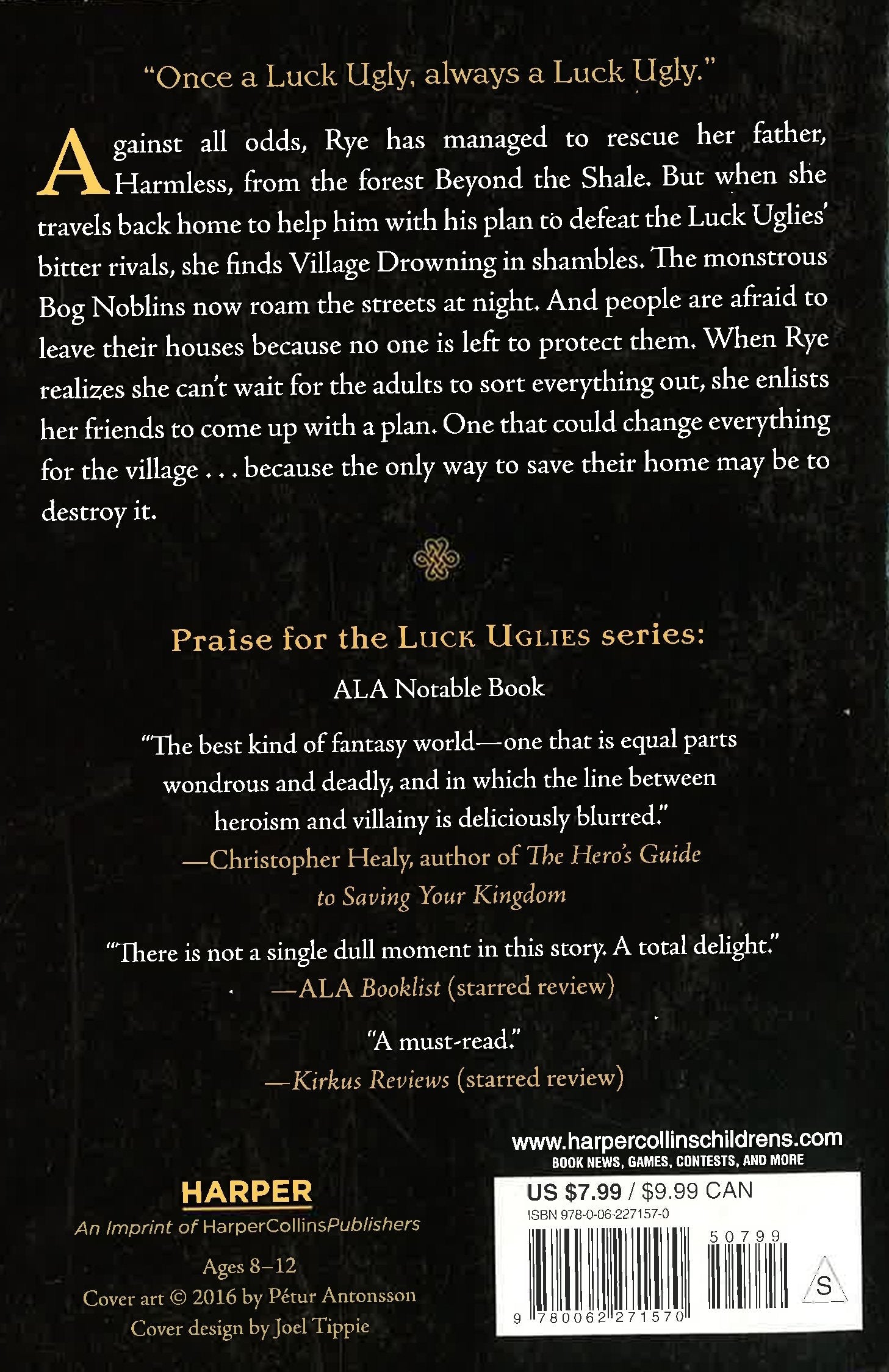 Against all odds, Rye has managed to rescue her father, Harmless, from the forest Beyond the Shale. But when she travels back home to help him with his plan to defeat the Luck Uglies' bitter rivals, she finds Village Drowning in shambles. The monstrous Bog Noblins now roam the streets at night. And people are afraid to leave their houses because no one is left to protect them. When Rye realizes she can't wait for the adults to sort everything out, she enlists her friends to come up with a plan. One that could change everything for the village . . . because the only way to save their home may be to destroy it.