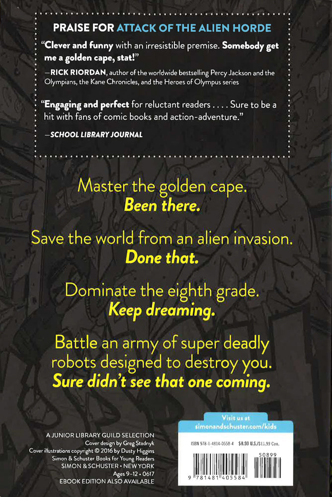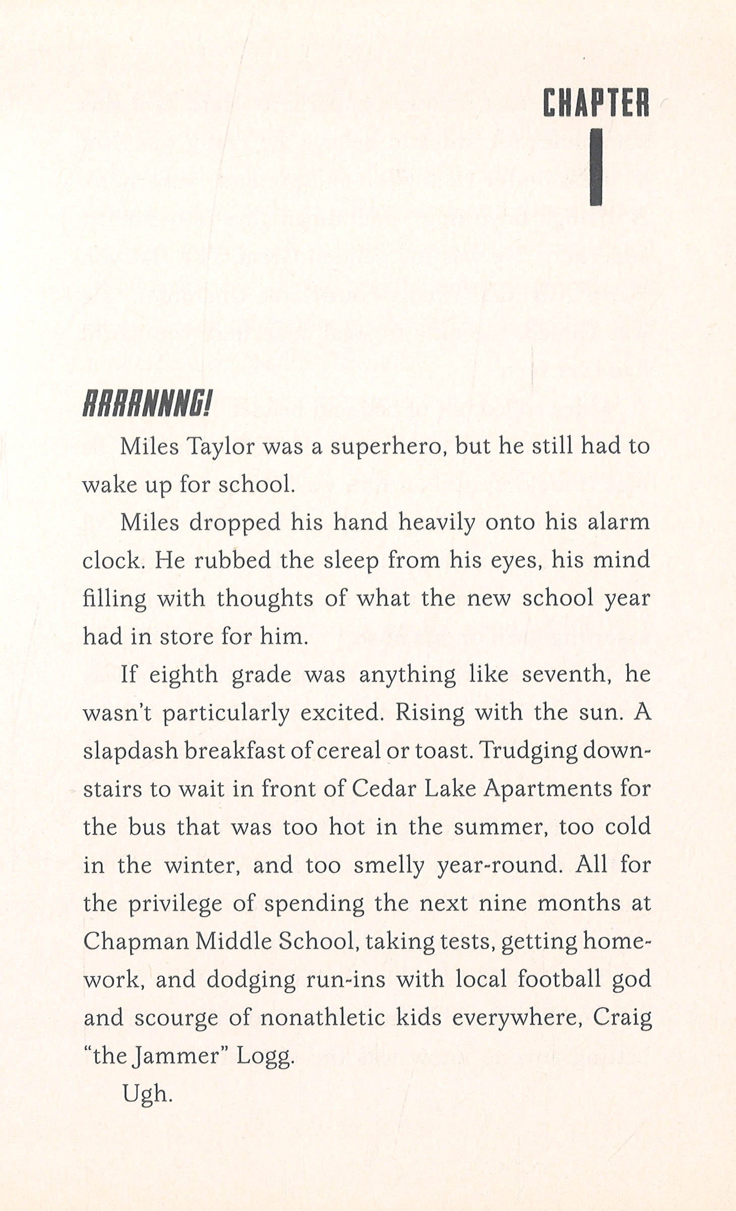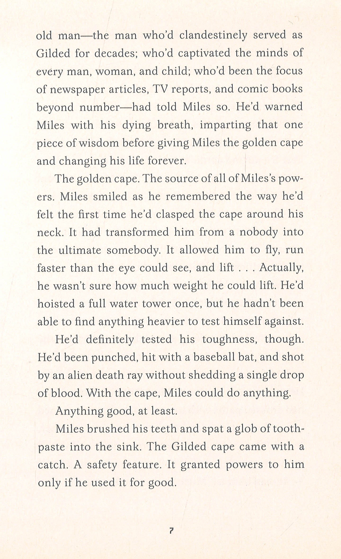 Sure didn't see that one coming. After a summer of fighting crime as Gilded, the world's only superhero, Miles Taylor is bummed to learn that nothing has changed for him at Chapman Middle School. He is still the primary target of the Jammer's bullying. And Josie, the girl of his dreams, has put him squarely in the friend zone. Miles starts spending more and more time as Gilded, neglecting his schoolwork and his friends. His bad attitude lands him and his best friend, Henry, in a military compound, at the mercy of the power-crazed General Breckenridge. When the general steals the golden cape, Miles finds himself back at square one with no superpowers...and no hope of escape. On the verge of losing everything--and everyone--he cares about, Miles must discover the hero within himself before the general puts his evil plans into action.