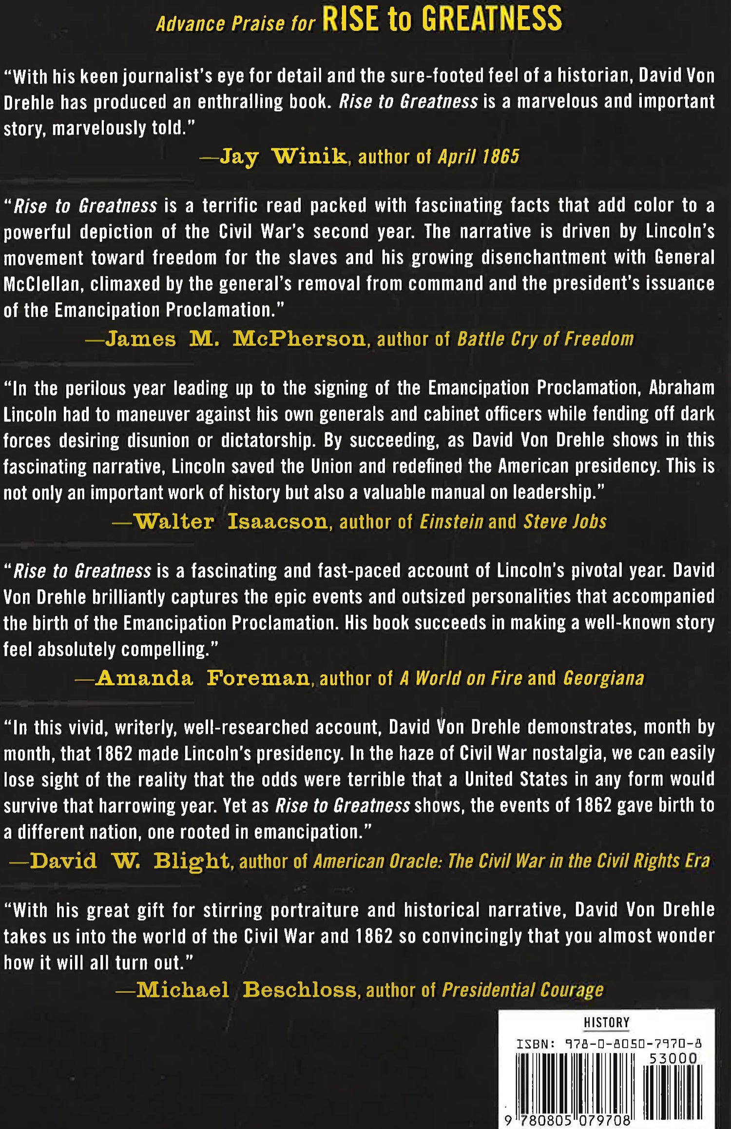 The electrifying story of Abraham Lincoln's rise to greatness during the most perilous year in our nation's historyAs 1862 dawned, the American republic was at death's door. The federal government appeared overwhelmed, the U.S. Treasury was broke, and the Union's top general was gravely ill. The Confederacy--with its booming economy, expert military leadership, and commanding position on the battlefield--had a clear view to victory. To a remarkable extent, the survival of the country depended on the judgment, cunning, and resilience of the unschooled frontier lawyer who had recently been elected president.Twelve months later, the Civil War had become a cataclysm but the tide had turned. The Union generals who would win the war had at last emerged, and the Confederate Army had suffered the key losses that would lead to its doom. The blueprint of modern America--an expanding colossus of industrial and financial might--had been indelibly inked. And the man who brought the nation through its darkest hour, Abraham Lincoln, had been forged into a singular leader.In "Rise to Greatness," acclaimed author David Von Drehle has created both a deeply human portrait of America's greatest president and a rich, dramatic narrative about our most fateful year.
