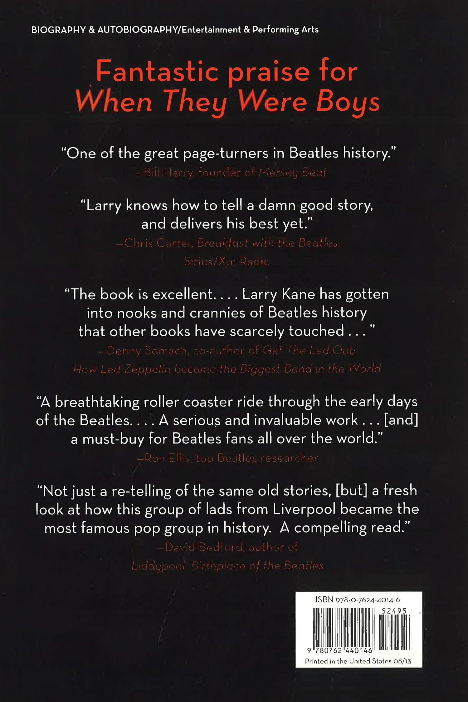 This is the story of the Beatles' harrowing rise to fame: focusing on that seven-year stretch from the time the boys met as teenagers to early 1964, when the Fab Four made their momentous first appearance on The Ed Sullivan Show . From the boys' humble beginnings in Liverpool, to the cellars of Hamburg, When They Were Boys includes stories never before told, including the heartbreaks and the lucky breaks. Included are an eyewitness account of that first meeting between Lennon and McCartney, the inside story of how Ringo replaced Pete Best, an exploration of the brilliant but troubled soul of manager Brian Epstein, and the real scoop on their disastrous first visit to Germany and the death of Stu Sutcliffe. With an eye for life in Liverpool during the 50's and 60's and over 65 eyewitness accounts from those closest to the Beatles, Larry Kane brings to life theevolution of the group that changed music forever.