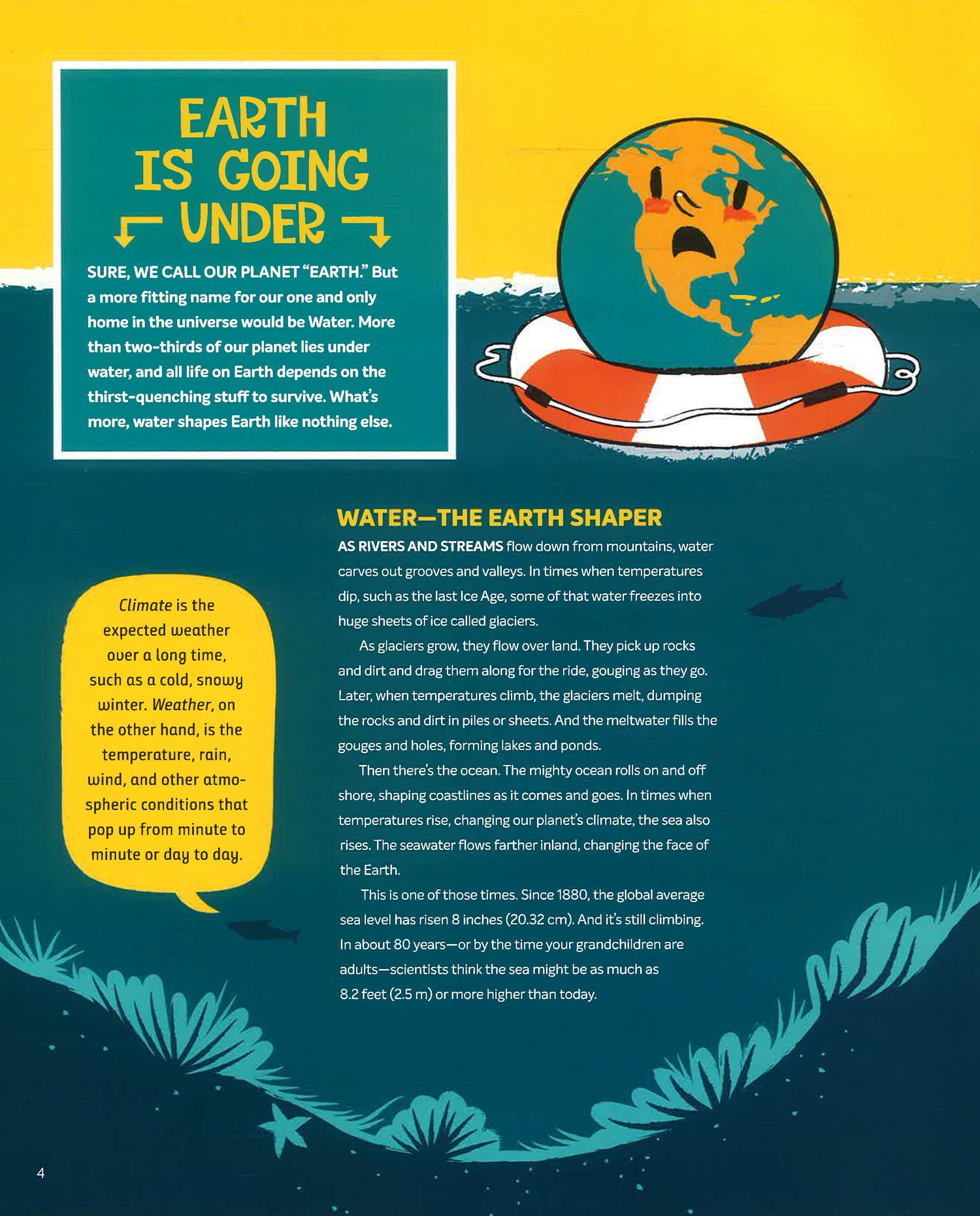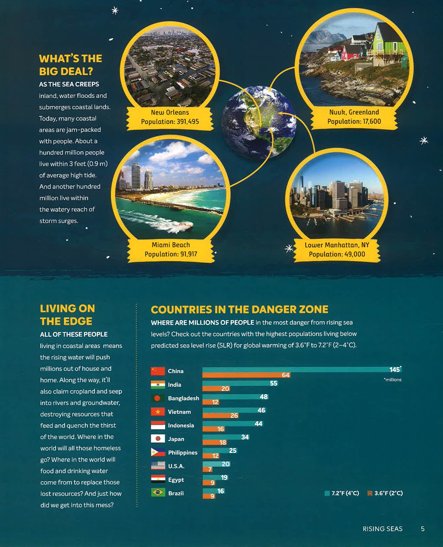 Rising Seas: Flooding, Climate Change and Our New World gives youth an eye-popping view of what the Earth might look like under the rising and falling water levels of climate change. Photographs juxtapose the present-day with that same area's projected future. The shocking images will help them understand the urgency for action. Key issues in today's news will be better understood, such as the 2015 Paris Protocol in which the world agreed to limit temperature increases to 2 degrees Celsius (ideally 1.5 degree).