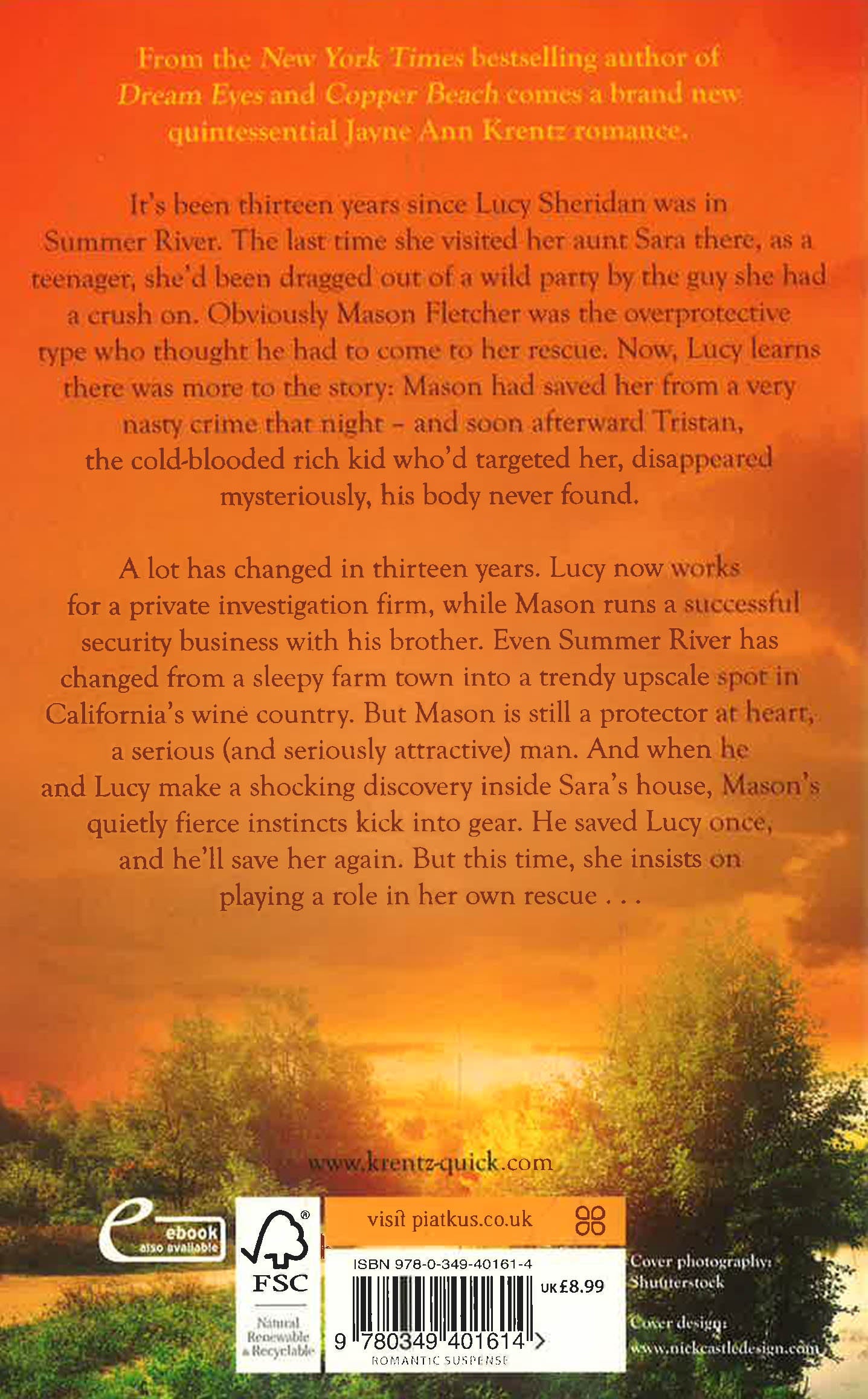 Thirteen years ago, Lucy Sheridan was dragged out of a wild party by the older guy she had a crush on. Now, returning to Summer River in California’s wine country after her aunt’s fatal car accident, Lucy is learning there was more to the story than she realized. Mason Fletcher saved her from a very nasty crime that night—and soon afterward, Tristan, the cold-blooded rich kid who’d targeted her, mysteriously disappeared…