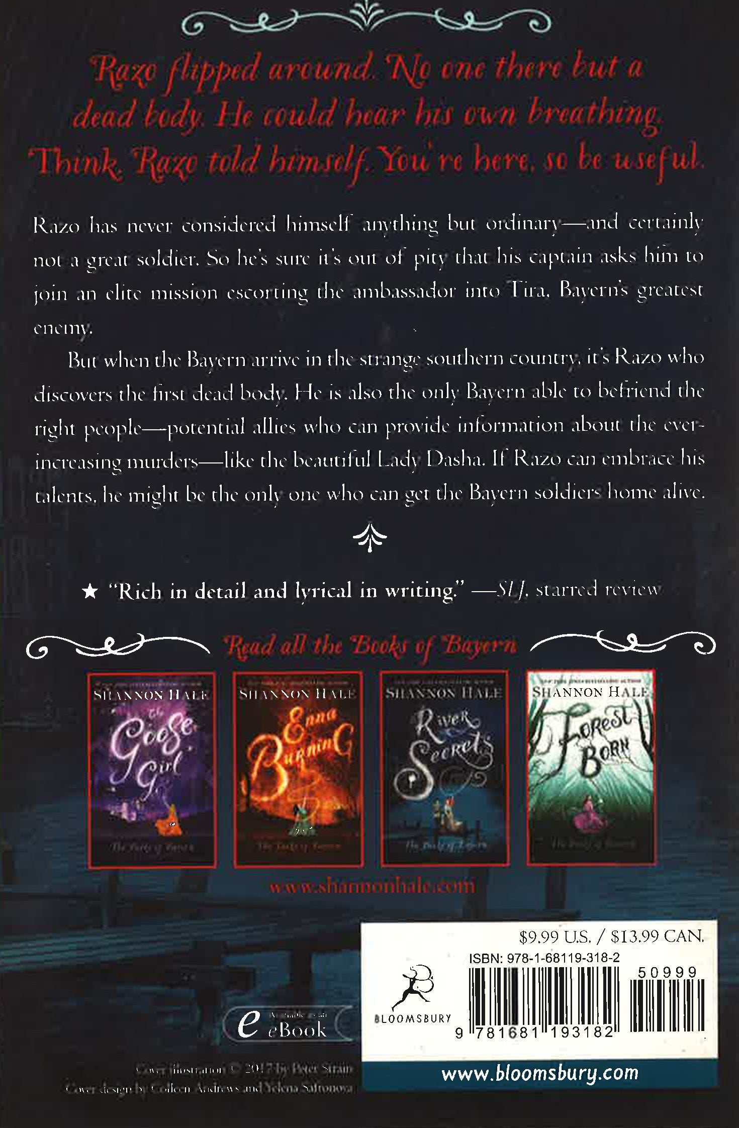 Razo has never considered himself anything but ordinary - and certainly not a great soldier. So he's sure it's out of pity that his captain asks him to join an elite mission escorting the ambassador into Tira, Bayern's greatest enemy.But when the Bayern arrive in the strange southern country, it's Razo who discovers the first dead body. He is also the only Bayern able to befriend the right people - potential allies who can provide information about the ever-increasing murders - like the beautiful Lady Dasha. If Razo can embrace his talents, he might be the only one who can get the Bayern soldiers home alive.
