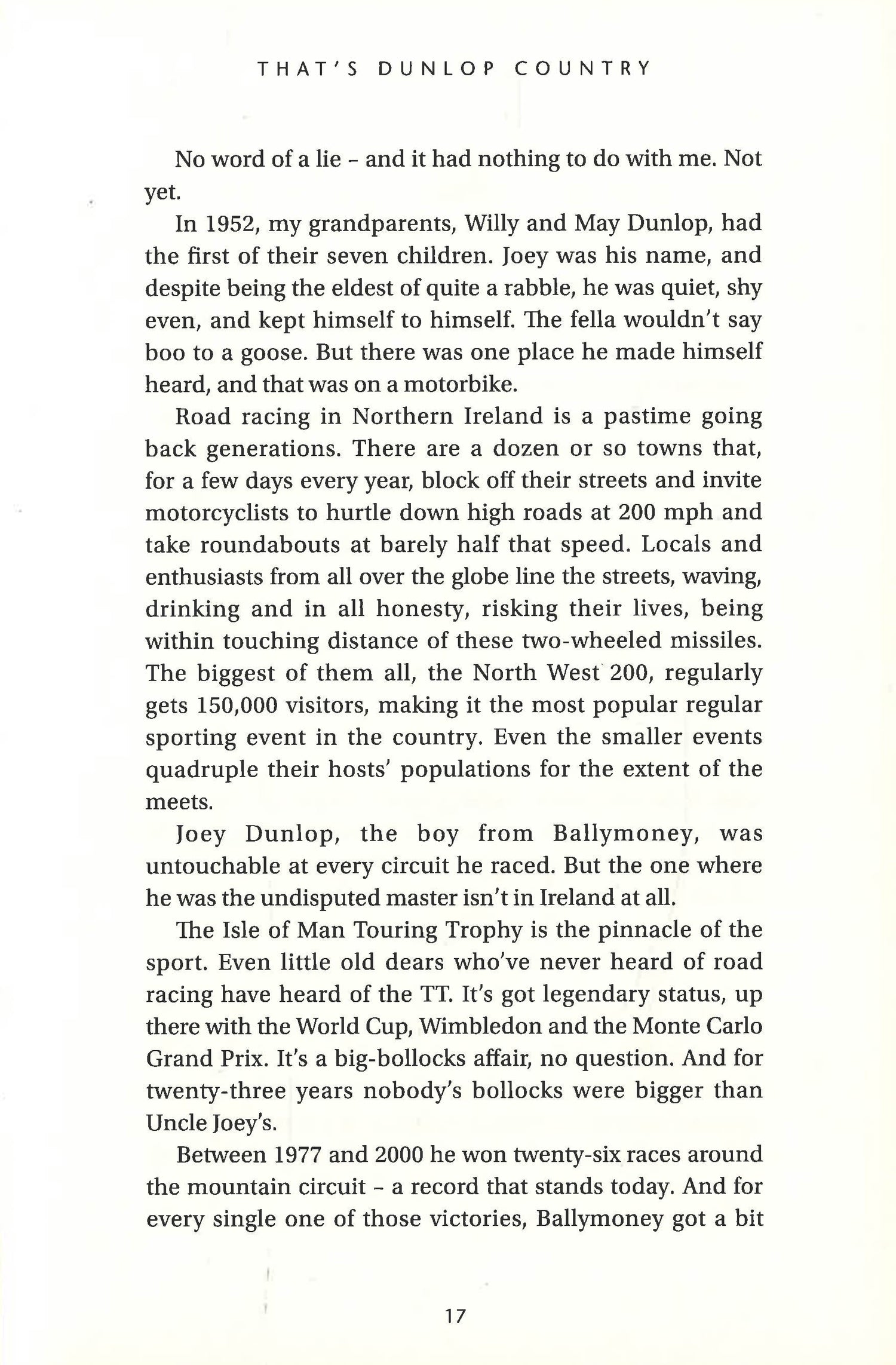 Michael Dunlop is quite simply the greatest road racer on the planet. Brother of William, also an accomplished rider, son of the late Robert and nephew of the late great Joey Dunlop, Michael can fairly claim that racing is in his blood. Now for the first time he talks in depth about his family story, how he got involved in the family business and how he manages to keep getting back on his bike despite all he knows of the deadly risks he encounters every time he crosses the start line.