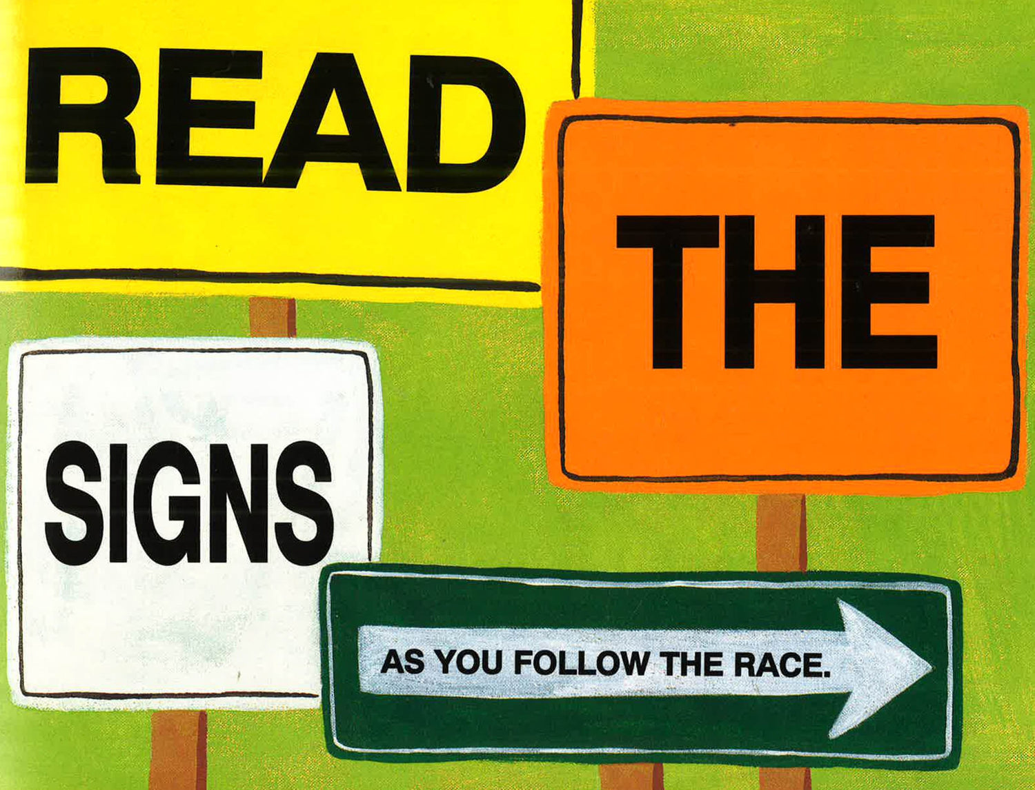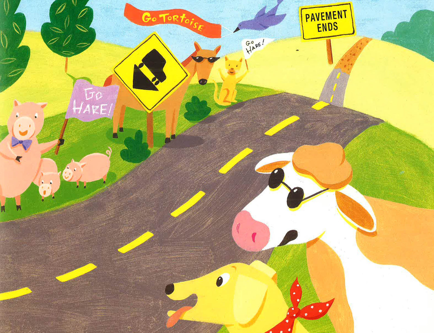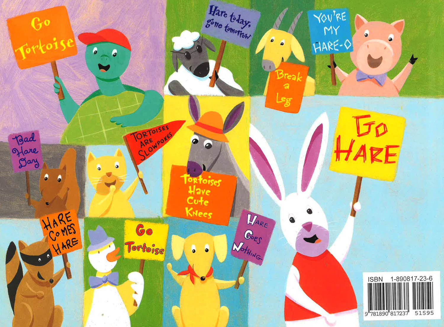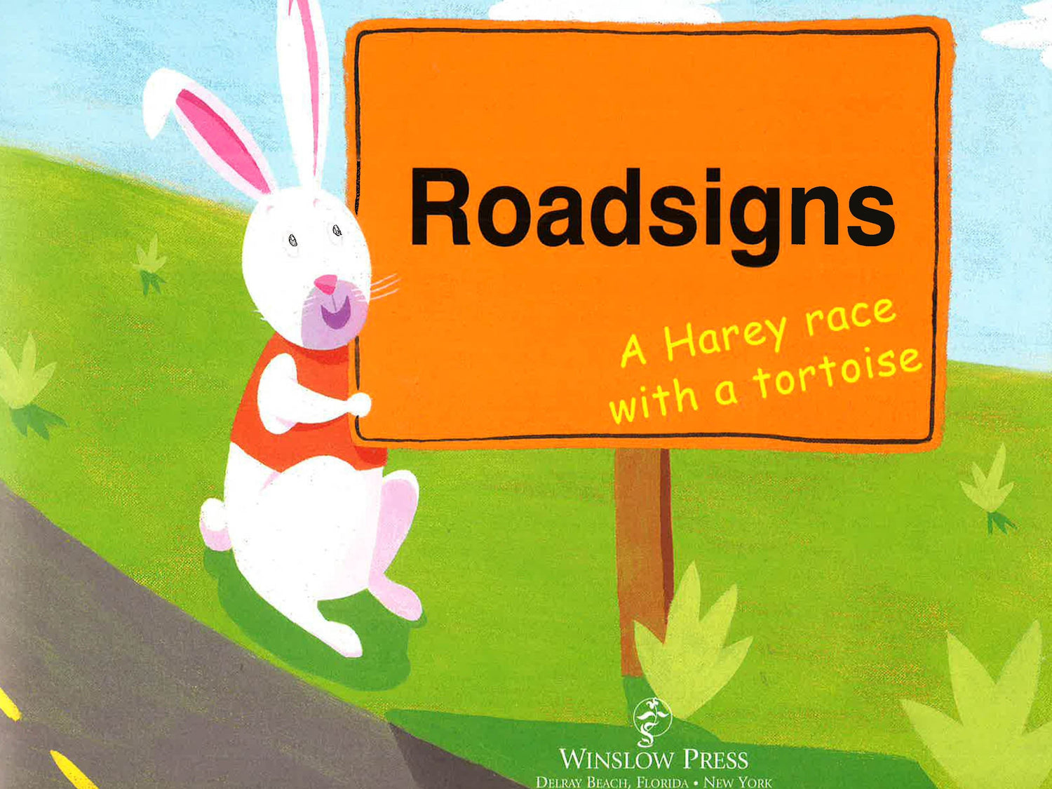 In a unique rendering of Aesop's classic fable, the Tortoise and the Hare race along a route lined with actual and made-up road signs as well as signs held in the air by spectators, and they brave a broken bridge, construction detours, dips, bumps, and steep grades.