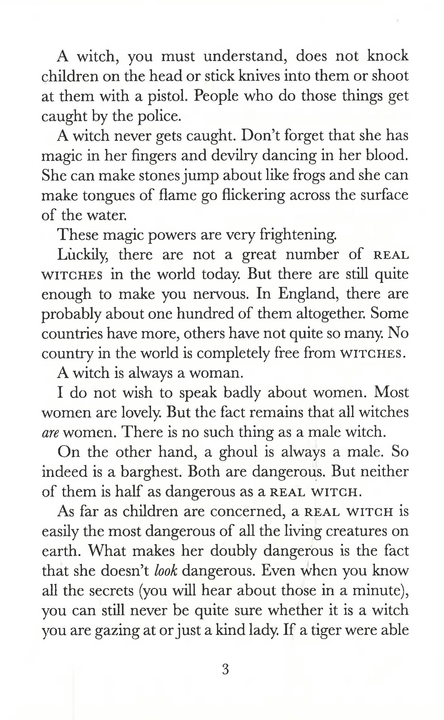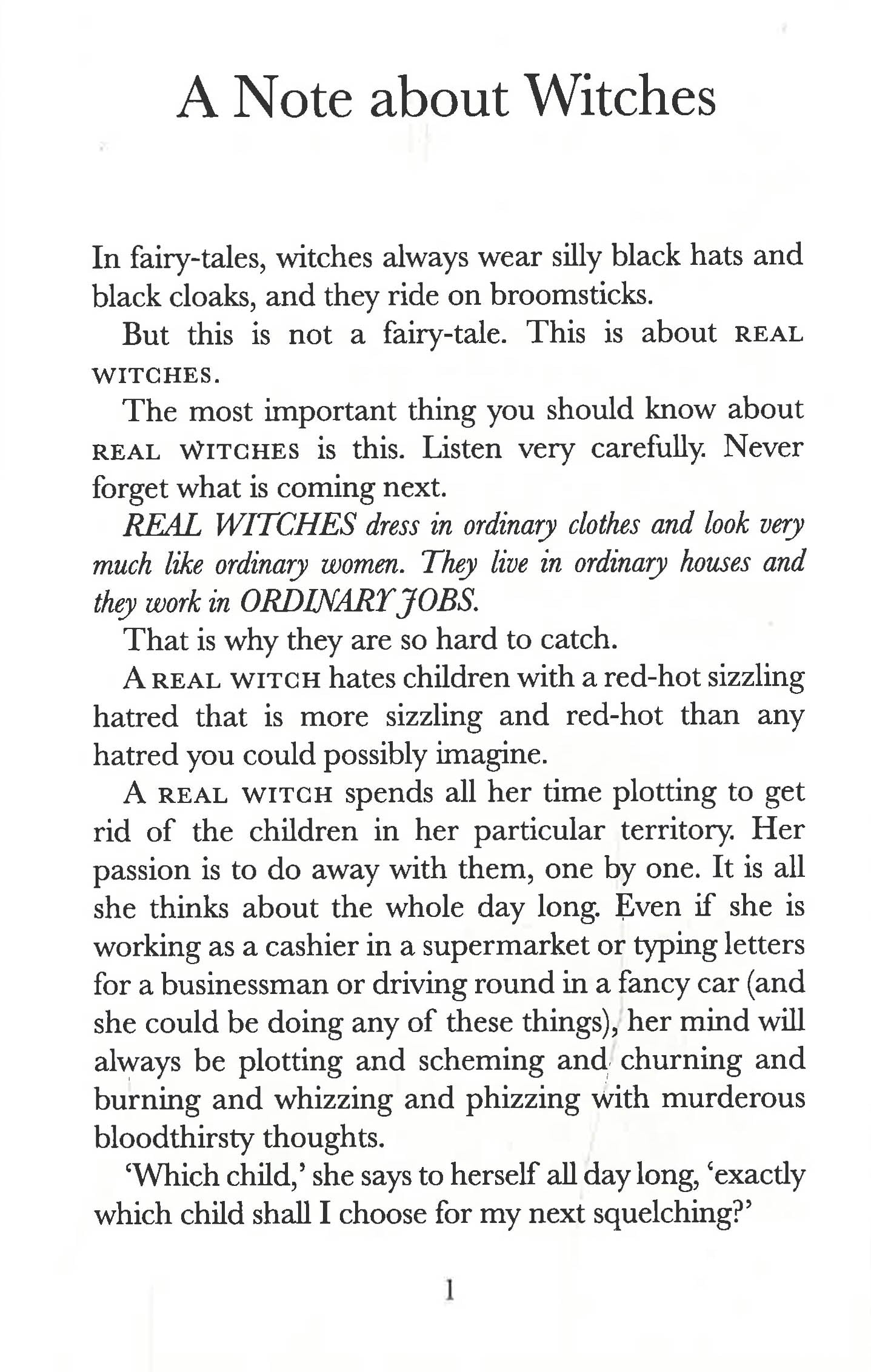 Grandmamma loves to tell about witches. Real witches are the most dangerous of all living creatures on earth. There's nothing they hate so much as children, and they work all kinds of terrifying spells to get rid of them. Her grandson listens closely to Grandmamma's stories--but nothing can prepare him for the day he comes face-to-face with The Grand High Witch herself!
