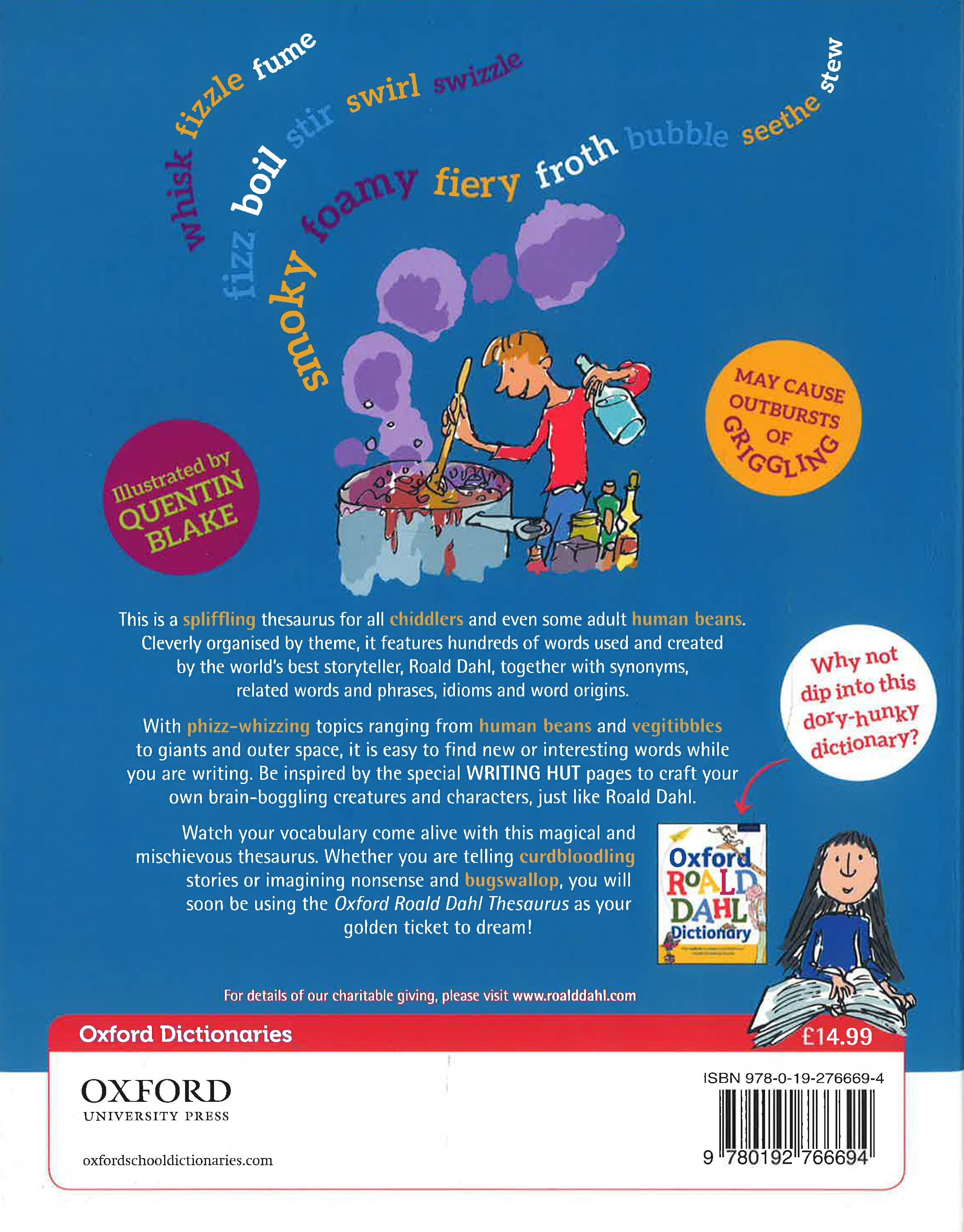 This is a treasure trove of lickswishy language to inspire children to write creatively. Organised thematically, it dives into the Roald Dahl worlds of Human Beans, the Natural World, Magical World and the World of Words. Working in themes makes it easy for children to discover hundreds of invented words and real words for their own stories. It is full of endlessly inventive vocabulary ideas and information, with a striking and fun design using Quentin Blake's artwork and a mixture of photographs too. Compiled by Susan Rennie, the lexicographer who created the Oxford Roald Dahl Dictionary and Roald Dahl's Rotsome and Repulsant Words, this captures Oxford University Press's language expertise, mixes it with the magic of Roald Dahl's language and delivers aunique and inspired book that is a joy to own.