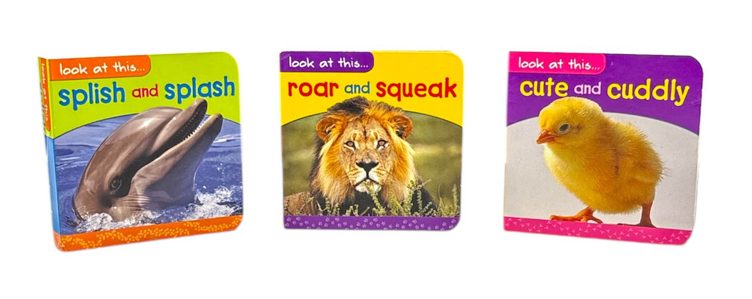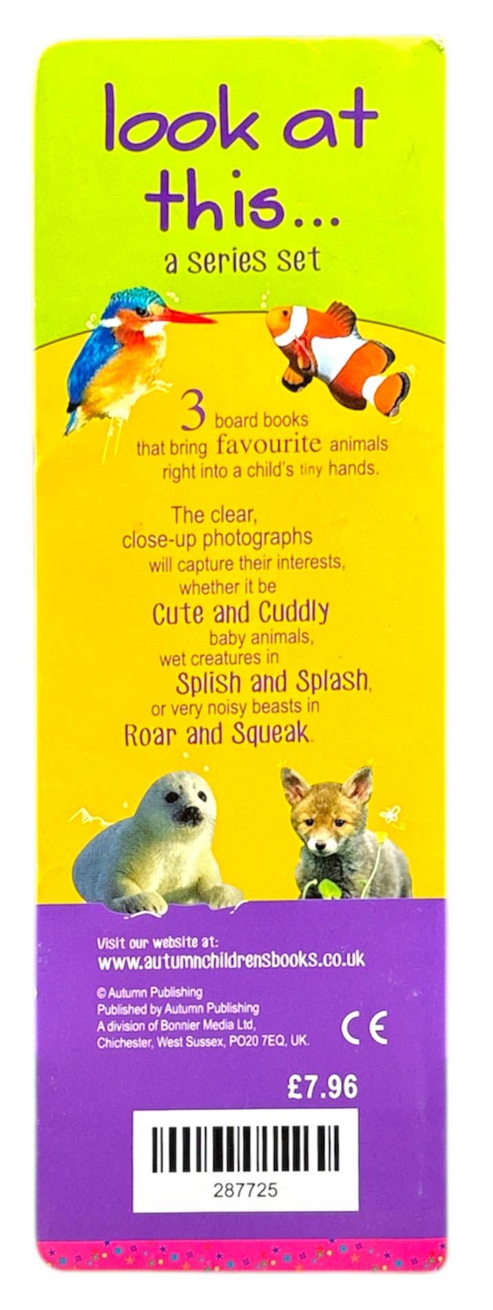 3 board books that bring favourite animals right into a child's tiny hands. The clear, close-up photographs will capture their interests, whether it be Cute and Cuddly baby animals, wet creatures in Splish and Splash. or very noisy beasts in Roar and Squeak.