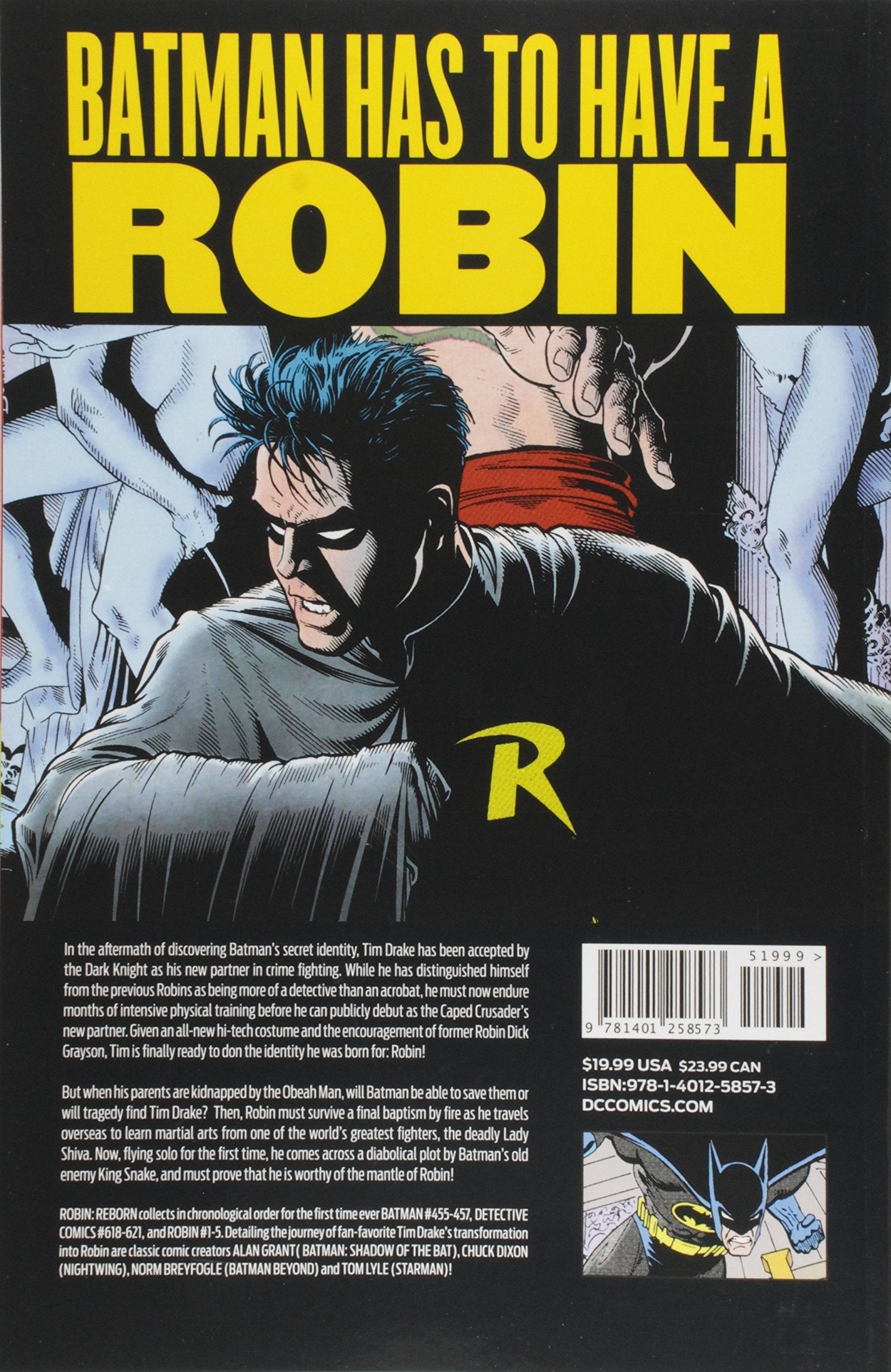 After discovering Batman’s identity, Tim Drake must now endure months of intensive physical training before he can publicly debut as the Caped Crusader’s new partner. Given an all-new hi-tech costume and the encouragement of former Robin Dick Grayson, Tim is finally ready to don the identity he was born for: Robin! But when his parents are kidnapped by the Obeah Man will Batman be able to save them or will tragedy find Tim Drake?Then, Robin must survive a final baptism by fire as he travels overseas to learn martial arts from one of the world’s greatest fighters - the deadly Lady Siva. Flying solo for the first time, he comes across a diabolical plot by Batman’s old enemy King Snake and must prove that he is worthy of the mantle of Robin!ROBIN: REBORN collects in chronological order for the first time ever BATMAN #455-457, DETECTIVE COMICS #618-621, and ROBIN #1-5. Detailing the journey of fan favorite Tim Drake’s transformation into Robin are classic comic creators ALAN GRANT( BATMAN: SHADOW OF THE BAT), CHUCK DIXON (NIGHTWING), NORM BREYFOGLE (BATMAN BEYOND) and TOM LYLE (STARMAN)!