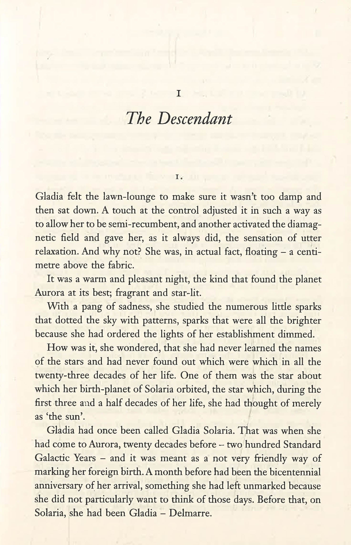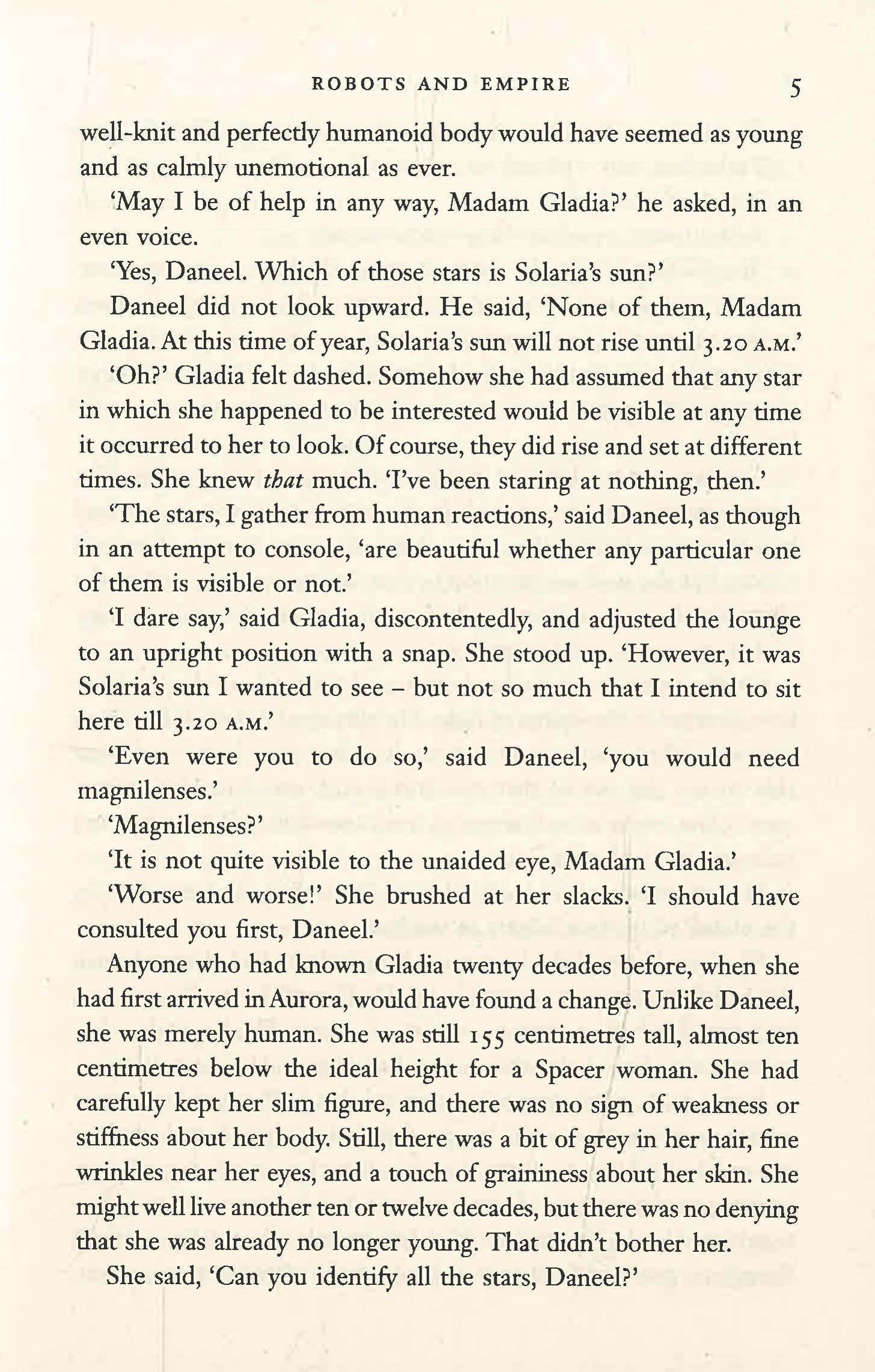 Accompanied by Gladia Delmarre and the robots Daneel and Giskard, a descendant of Elijah Baley sets out for Solaria to investigate, a quest that will lead them to a vast, catastrophic conspiracy and a revolution in the Three Laws of Robotics.