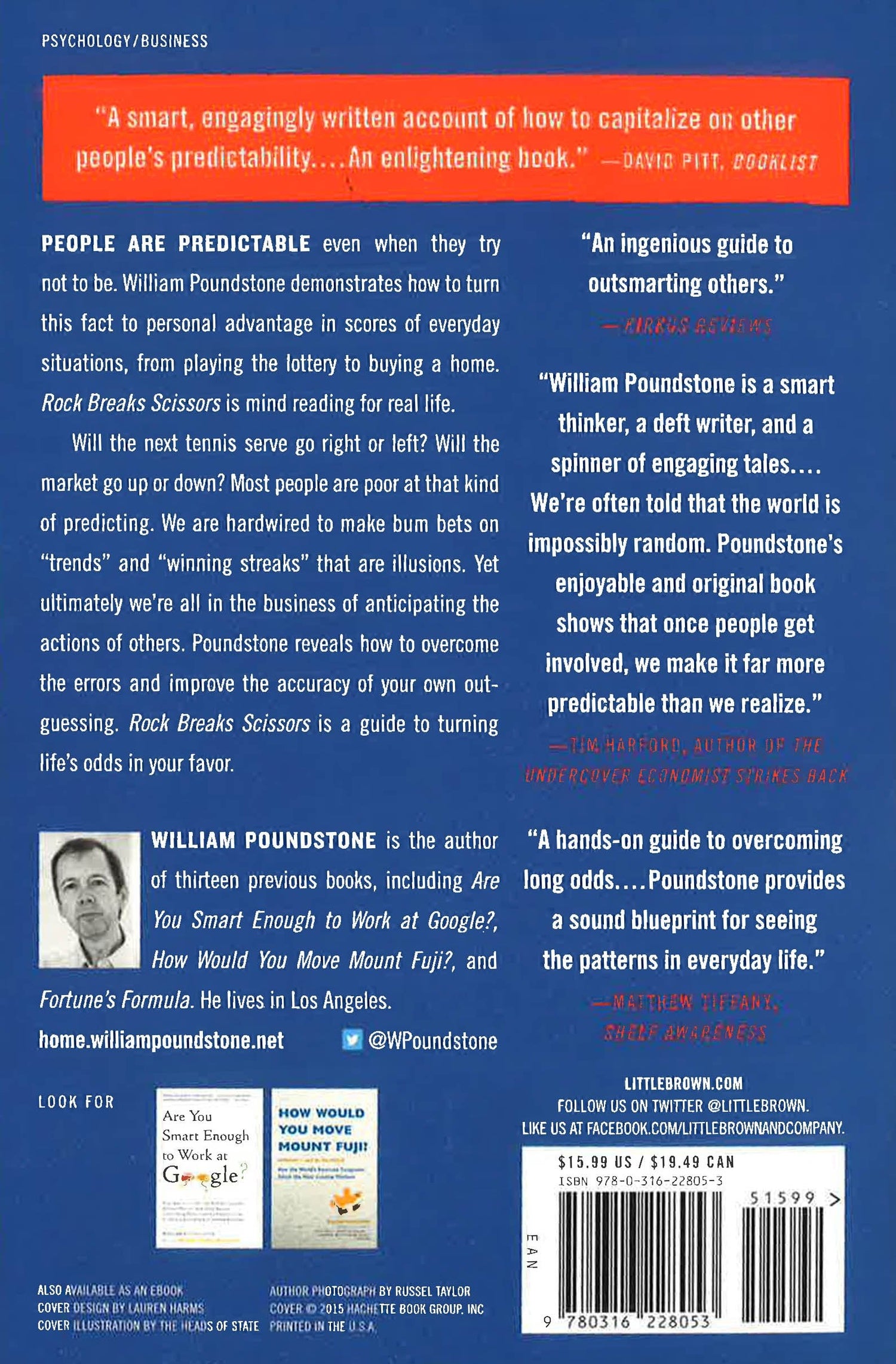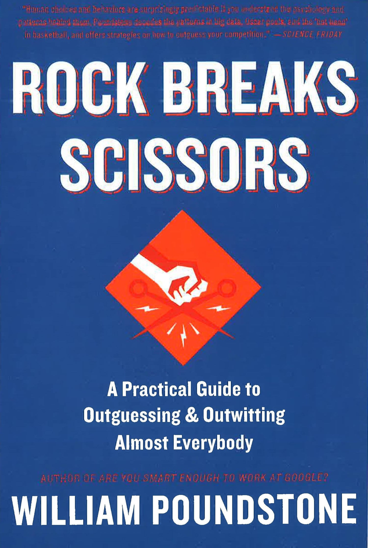 A practical guide to outguessing everything, from multiple-choice tests to the office football pool to the stock market. People are predictable even when they try not to be. William Poundstone demonstrates how to turn this fact to personal advantage in scores of everyday situations, from playing the lottery to buying a home. Rock Breaks Scissors is mind-reading for real life. Will the next tennis serve go right or left? Will the market go up or down? Most people are poor at that kind of predicting. We are hard-wired to make bum bets on "trends" and "winning streaks" that are illusions. Yet ultimately we're all in the business of anticipating the actions of others. Poundstone reveals how to overcome the errors and improve the accuracy of your own outguessing. Rock Breaks Scissors is a hands-on guide to turning life's odds in your favor.
