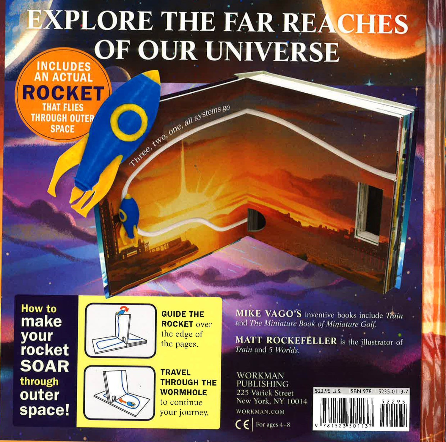 Take a journey through the pages on your own rocket ship!In Rocket, the story of a spacecraft moving through the far reaches of space, the reader gets to pilot a three-dimensional plastic rocket that never leaves the book, moving on an internal track from front to back, up and over the pages.You’ll soar, sail, swoop, and explore, visiting some of the most intriguing sights in our solar system, then the Milky Way, and into far-off galaxies. With lively rhyming language and a feast of stars, planets, comets, moons, and other celestial bodies, it’s an interactive journey of imagination and science.