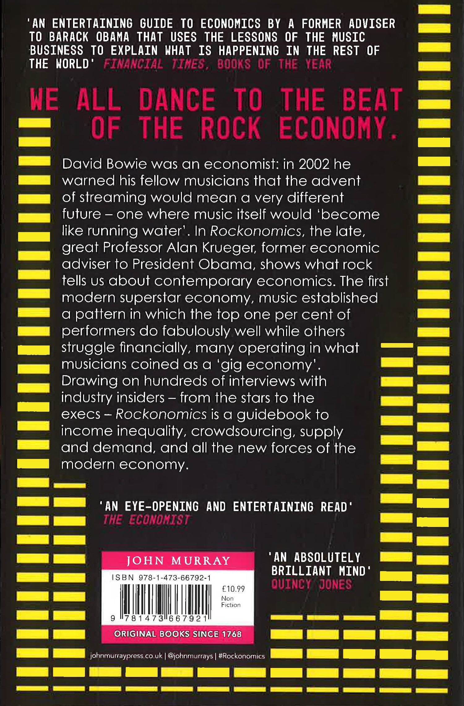 An entertaining guide to economics by a former adviser to Barack Obama that uses the lessons of the music business to explain what is happening in the rest of the world' The Times, Books of the Year'A key voice on a vast array of economic issues for more than two decades' Barack Obama'An absolutely brilliant mind. The definition of left and right brain balance' Quincy Jones'The music business keeps re-inventing itself (from records, to tape, to CDs to streaming) and Alan Krueger covers all the bases. As one former LSE student once sang: 'its only rock and roll but I like it, like it, yes I do.' That applies to this book too' Richard Thaler, Nobel Prize Recipient and author of 'Nudge''Rockonomics is entertaining, educational and enlightening. Alan Krueger gives us a backstage tour of the music industry - and in doing so, he creates a brilliant metaphor for our entire economy. Highly recommended' Harlan CobenAlan Krueger, the former chairman of the president's Council of Economic Advisers, uses the music industry, from rock artists to music executives, from managers to promoters, as a way in to explain the principles of economics, and the forces shaping our economic lives.The music industry is often a leading indicator of today's economy; it is among the first to be disrupted by the latest wave of technology, and examining the ins and outs of how musicians create and sell new songs and plan concert tours offers valuable lessons for what is in store for businesses and employees in other industries that are struggling to adapt. Drawing on interviews with leading band members, music executives, managers, promoters, and using the latest data on revenues, royalties, tour dates, and merchandise, Rockonomics takes readers backstage to show how the music industry really works - who makes money, how the economics of the music industry has undergone a radical transformation during the last twenty years, and what this tells us about our wider economy today.