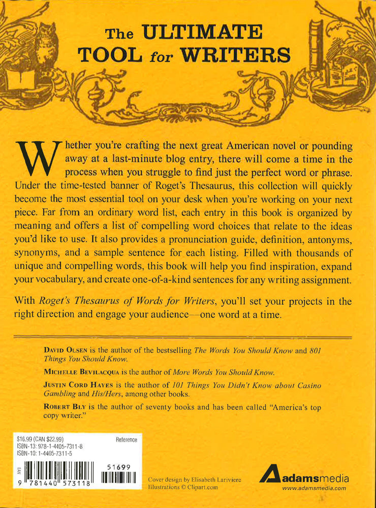 The ultimate tool for writers!Whether you're crafting the next great American novel or pounding away at a last-minute blog entry, there will come a time in the process when you struggle to find just the perfect word or phrase. Under the time-tested banner of Roget's Thesaurus, this collection will quickly become the most essential tool on your desk when you're working on your next piece. Far from an ordinary word list, each entry in this book is organized by meaning and offers a list of compelling word choices that relate to the ideas you'd like to use. It also provides a pronunciation guide, definition, antonyms, synonyms, and a sample sentence for each listing. Filled with thousands of unique and compelling words, this book will help you find inspiration, expand your vocabulary, and create one-of-a-kind sentences for any writing assignment.With Roget's Thesaurus of Words for Writers, you'll set your projects in the right direction and engage your audience--one word at a time.