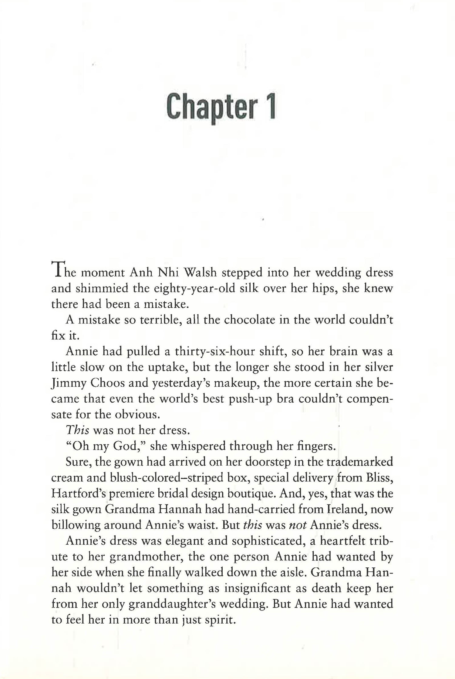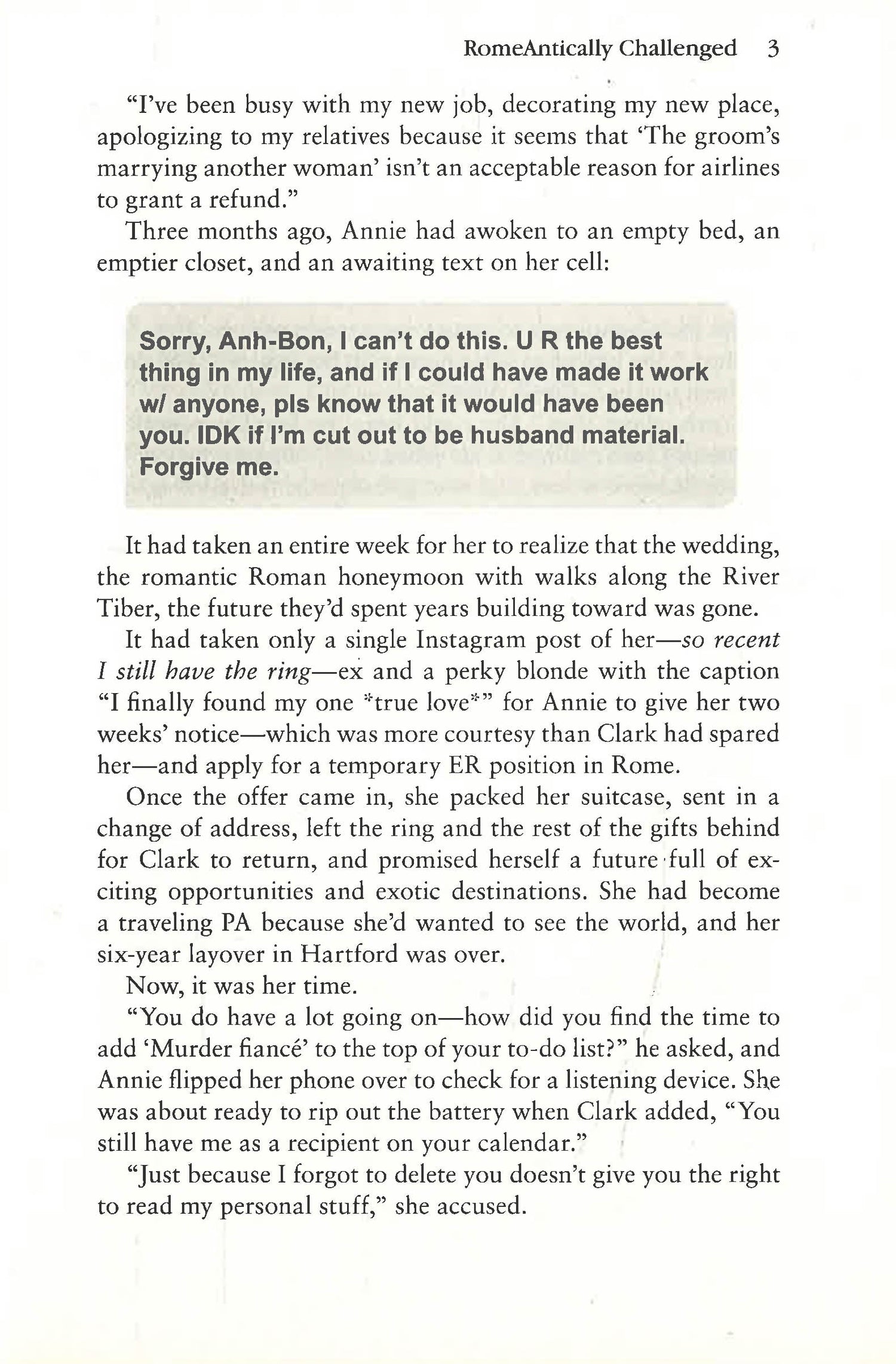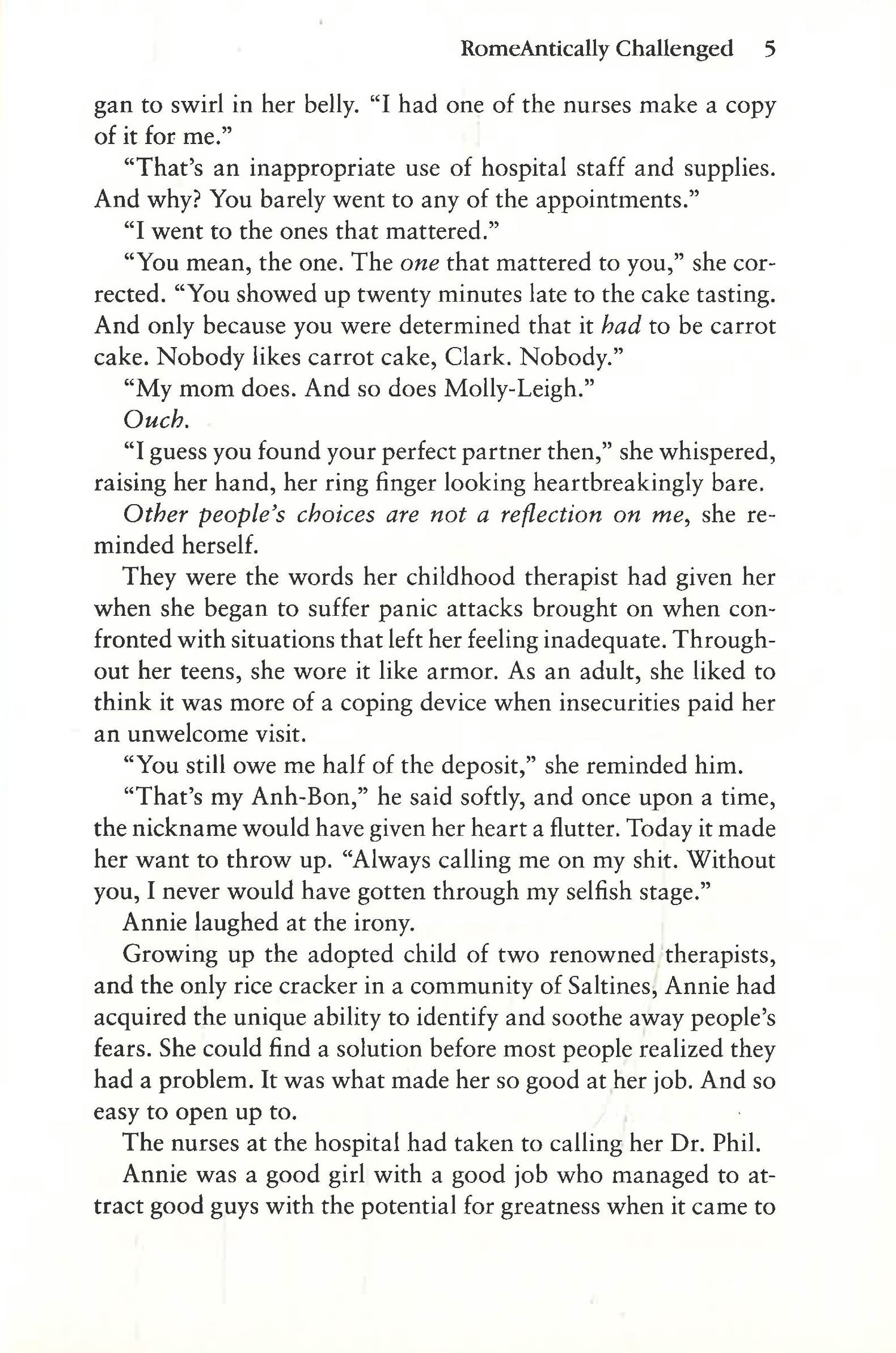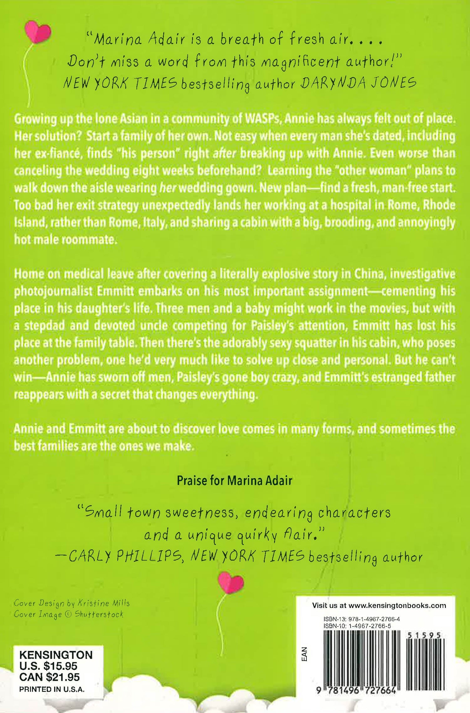 Growing up the lone Asian in a community of WASPs, Annie has always felt out of place. Her solution? Start a family of her own. Not easy when every man she’s dated, including her ex-fiancé, finds “his person” right after breaking up with Annie. Even worse than canceling the wedding eight weeks beforehand? Learning the “other woman” plans to walk down the aisle wearing her wedding gown. New plan—find a fresh, man-free start. Too bad her exit strategy unexpectedly lands her working at a hospital in Rome, Rhode Island, rather than Rome, Italy, and sharing a cabin with a big, brooding, and annoyingly hot male roommate.