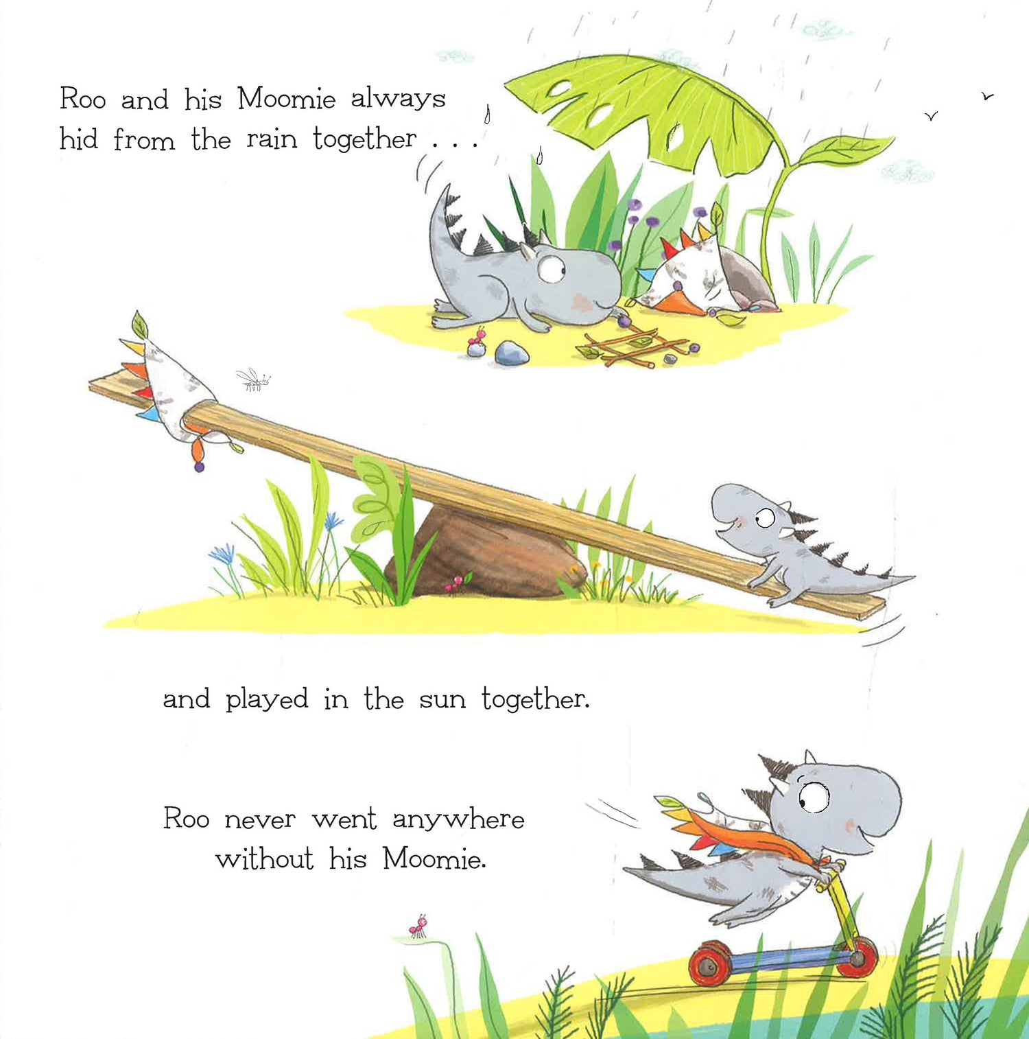 This is the story of Roo, a little dinosaur who one day meets a woolly mammoth in a hot-air balloon. The balloon has a hole and gradually deflates, floating down to the ground and leaving the little mammoth stranded. Roo saves the day by giving the mammoth a piece of his precious comfort blanket (his moomie, as he calls it) which they use to patch the hole. A story about kindness and sharing, with lovable characters created by the best-selling illustrator of the Lettice the Dancing Rabbit series, Mandy Stanley.