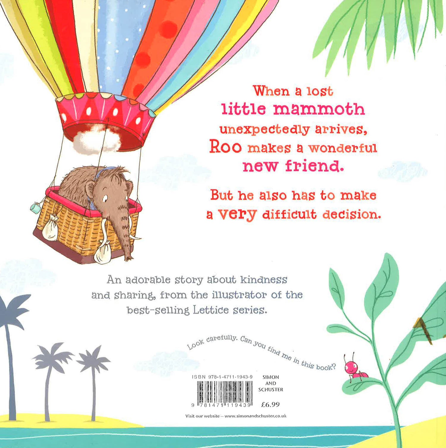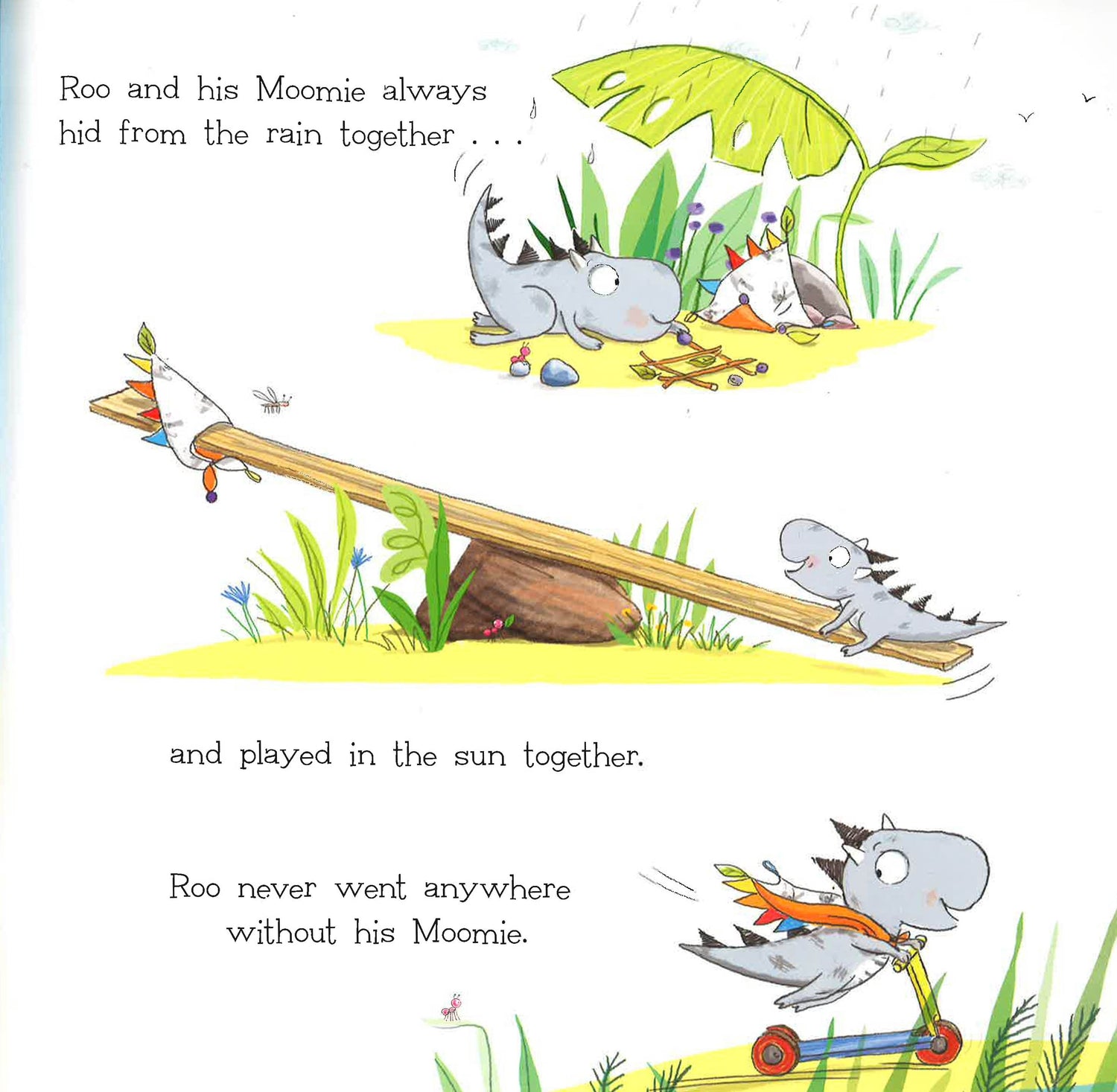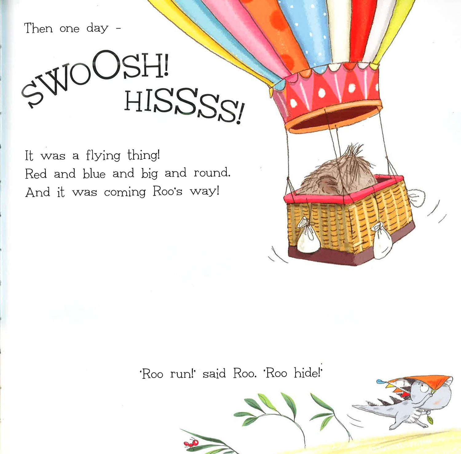 This is the story of Roo, a little dinosaur who one day meets a woolly mammoth in a hot-air balloon. The balloon has a hole and gradually deflates, floating down to the ground and leaving the little mammoth stranded. Roo saves the day by giving the mammoth a piece of his precious comfort blanket (his moomie, as he calls it) which they use to patch the hole.