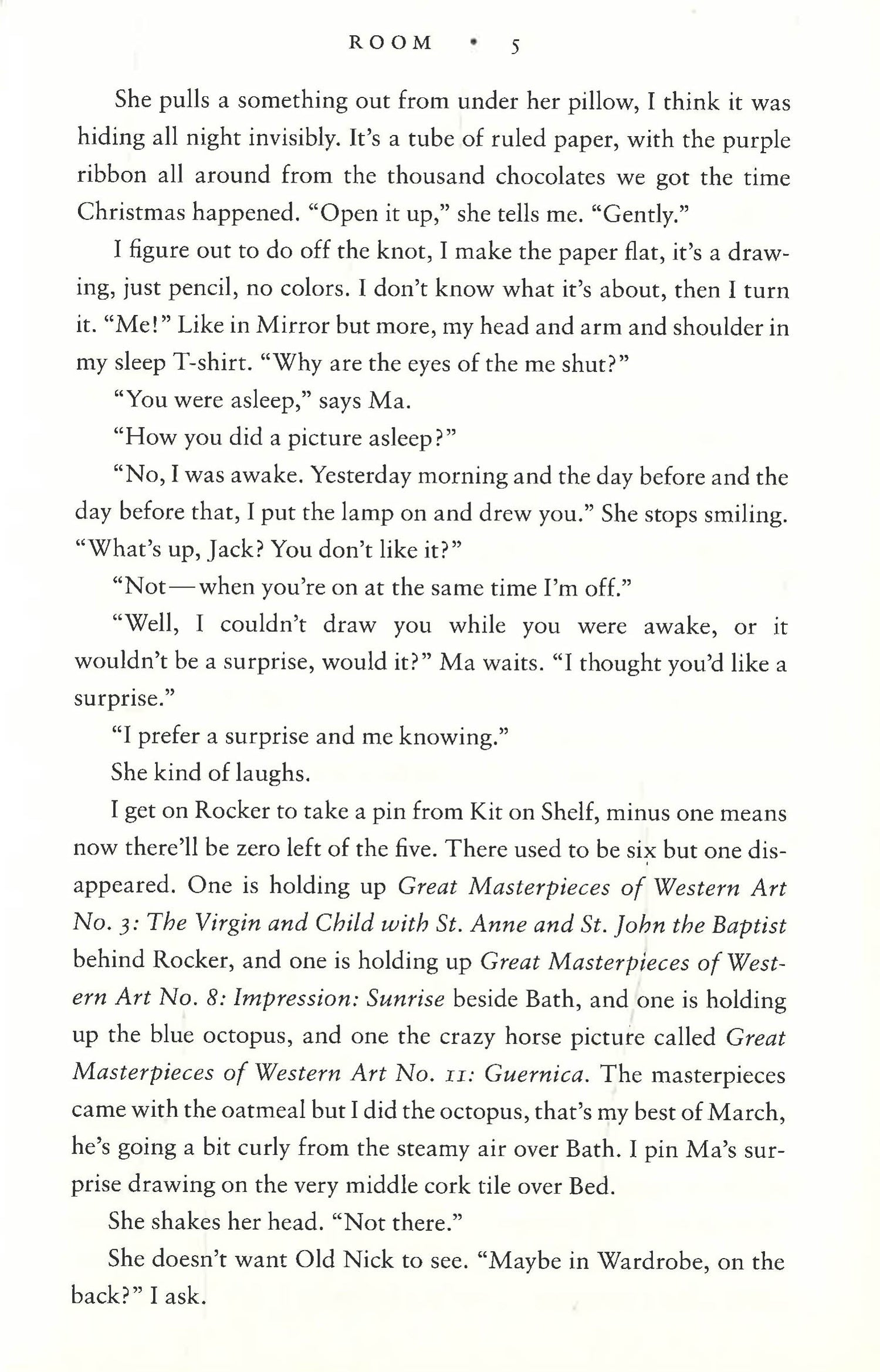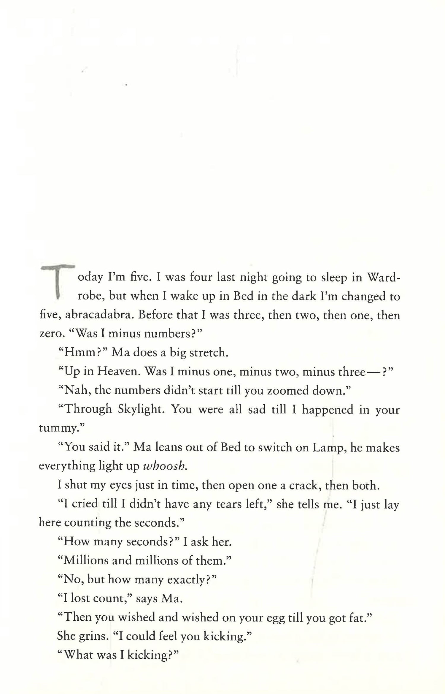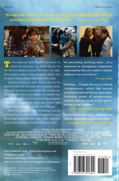 NOW A MAJOR MOTION PICTURE To five-year-old-Jack, Room is the world. . . . It's where he was born, it's where he and his Ma eat and sleep and play and learn. At night, his Ma shuts him safely in the wardrobe, where he is meant to be asleep when Old Nick visits. Room is home to Jack, but to Ma it's the prison where she has been held for seven years. Through her fierce love for her son, she has created a life for him in this eleven-by-eleven-foot space. But with Jack's curiosity building alongside her own desperation, she knows that Room cannot contain either much longer. Room is a tale at once shocking, riveting, exhilarating--a story of unconquerable love in harrowing circumstances, and of the diamond-hard bond between a mother and her child.