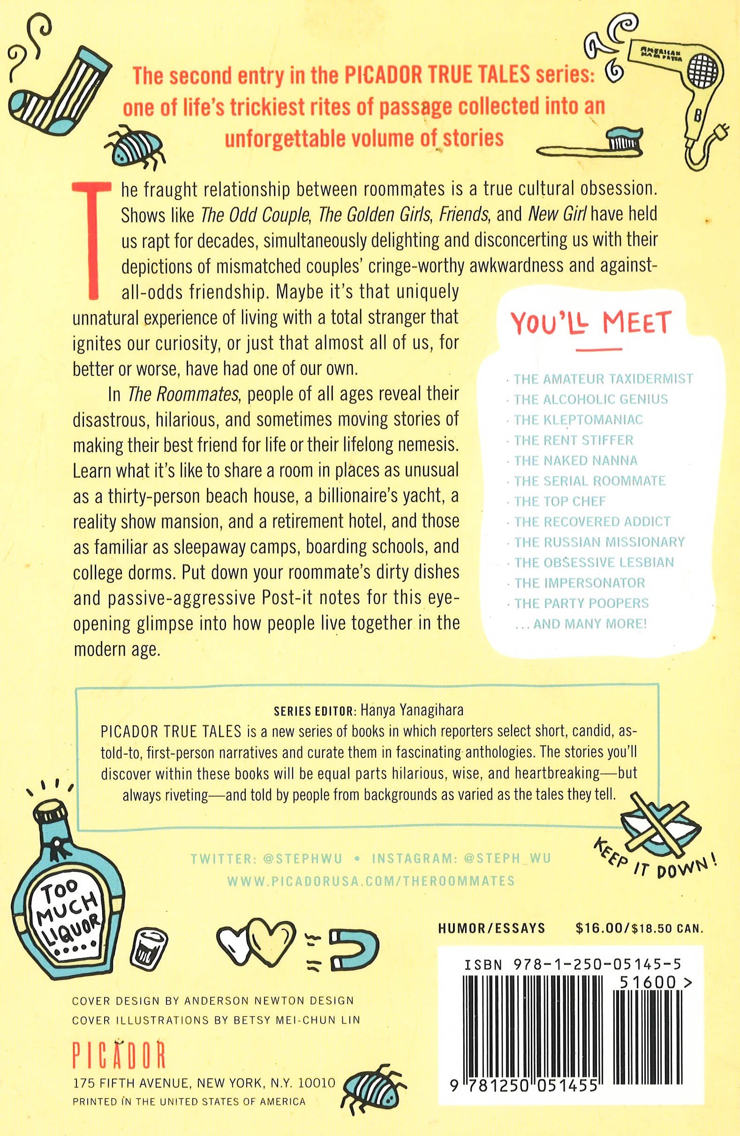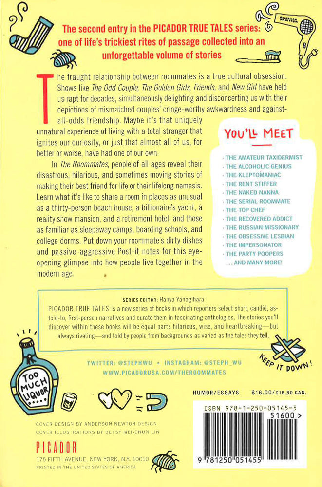 THE SECOND ENTRY IN THE PICADOR TRUE TALES SERIES: ONE OF LIFE'S TRICKIEST RITES OF PASSAGE COLLECTED INTO AN UNFORGETTABLE VOLUME OF STORIES The fraught relationship between roommates is a true cultural obsession. Shows like Friends , The Golden Girls , The Odd Couple , and New Girl have held us rapt for decades, simultaneously delighting and disconcerting us with their depictions of mismatched couples’ cringe-worthy awkwardness and against-all-odds friendship. Maybe it’s that uniquely unnatural experience of living with a total stranger that ignites our curiosity, or just that almost all of us, for better or worse, have had one of our own. In Stephanie Wu's The Roommates , people of all ages reveal their disastrous, hilarious, and sometimes moving stories of making their best friend for life or lifelong nemesis. Learn what it’s like to share a room in places as unusual as a thirty-person beach house, a billionaire’s yacht, a reality show mansion, and a retirement hotel, and those as familiar as sleepaway camps, boarding schools, and college dorms. Put down your roommate’s dirty dishes and passive-aggressive Post-it’s for this eye-opening glimpse into how people live together in the modern age. You’ll meet: The Amateur Taxidermist ? The Alcoholic Genius ? The Kleptomaniac ? The Rent Stiffer ? The Naked Nanna ? The Serial Roommate ? The Top Chef ? The Recovered Addict ? The Russian Missionary ? The Obsessive Lesbian ? The Impersonator ? The Party Poopers...and many more!
