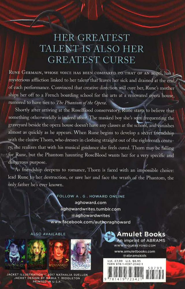 Rune Germaine moves to a boarding school outside of Paris, only to discover that at this opera-house-turned-music-conservatory, phantoms really do exist. RoseBlood is a Phantom of the Opera-inspired retelling in which Rune's biggest talent--her voice--is also her biggest curse. Fans of Daughter of Smoke and Bone and the Splintered series will find themselves captivated by this pulse-pounding spin on a classic tale. Rune, whose voice has been compared to that of an angel, has a mysterious affliction linked to her talent that leaves her sick and drained at the end of every performance. Convinced creative direction will cure her, her mother ships her off to a French boarding school for the arts, rumoured to have a haunted past. Shortly after arriving at RoseBlood conservatory, Rune starts to believe something otherworldly is indeed afoot. The mystery boy she's seen frequenting the graveyard beside the opera house doesn't have any classes at the school, and vanishes almost as quickly as he appears. When Rune begins to develop a secret friendship with the elusive Thorn, who dresses in clothing straight out of the 19th century, she realises that in his presence she feels cured. Thorn may be falling for Rune, but the phantom haunting RoseBlood wants her for a very specific and dangerous purpose. As their love continues to grow, Thorn is faced with an impossible choice: lead Rune to her destruction, or save her and face the wrath of the phantom, the only father he's ever known. A. G. Howard brings the romantic storytelling that Splintered fans adore to France--and an entirely new world filled with lavish romance and intrigue--in a retelling inspired by a story that has captivated generations.