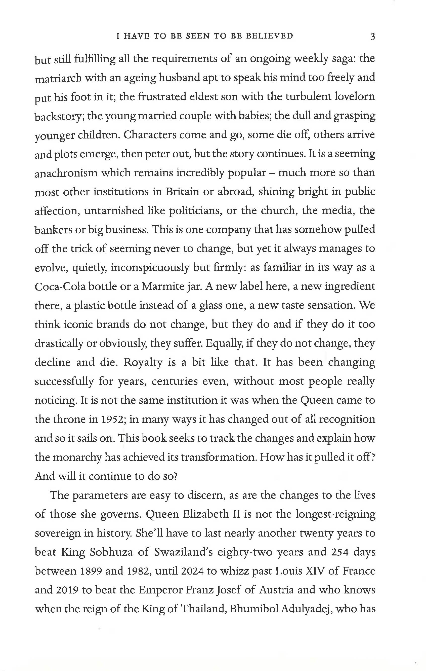 Her voice is redolent of another era, her interests are esoteric to many of her people, her opinions on anything from the weather to politics are almost entirely unknown, and her whole life has been lived without ever mingling on equal terms with anybody, except for one heady evening in 1945 when she slipped out of Buckingham Palace incognito to join the crowds celebrating the end of the war in Europe. The world has utterly, irreversibly, and radically evolved since she ascended the throne in 1952 and yet, in an era of instant celebrity, she remains, more popular than ever and seemingly largely unchanged: a bastion of certainty and comfort to the British and many other people during uncertain times.