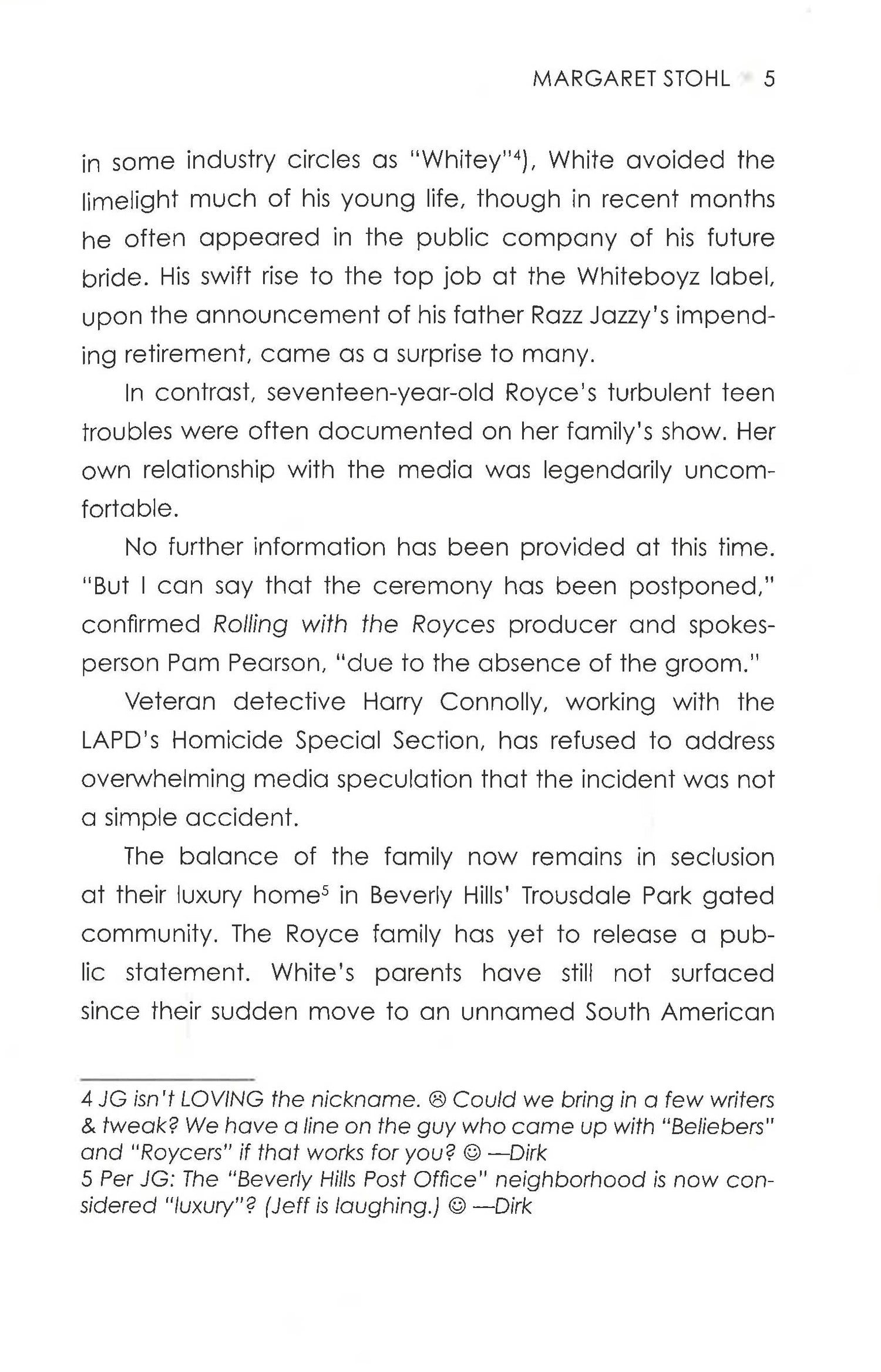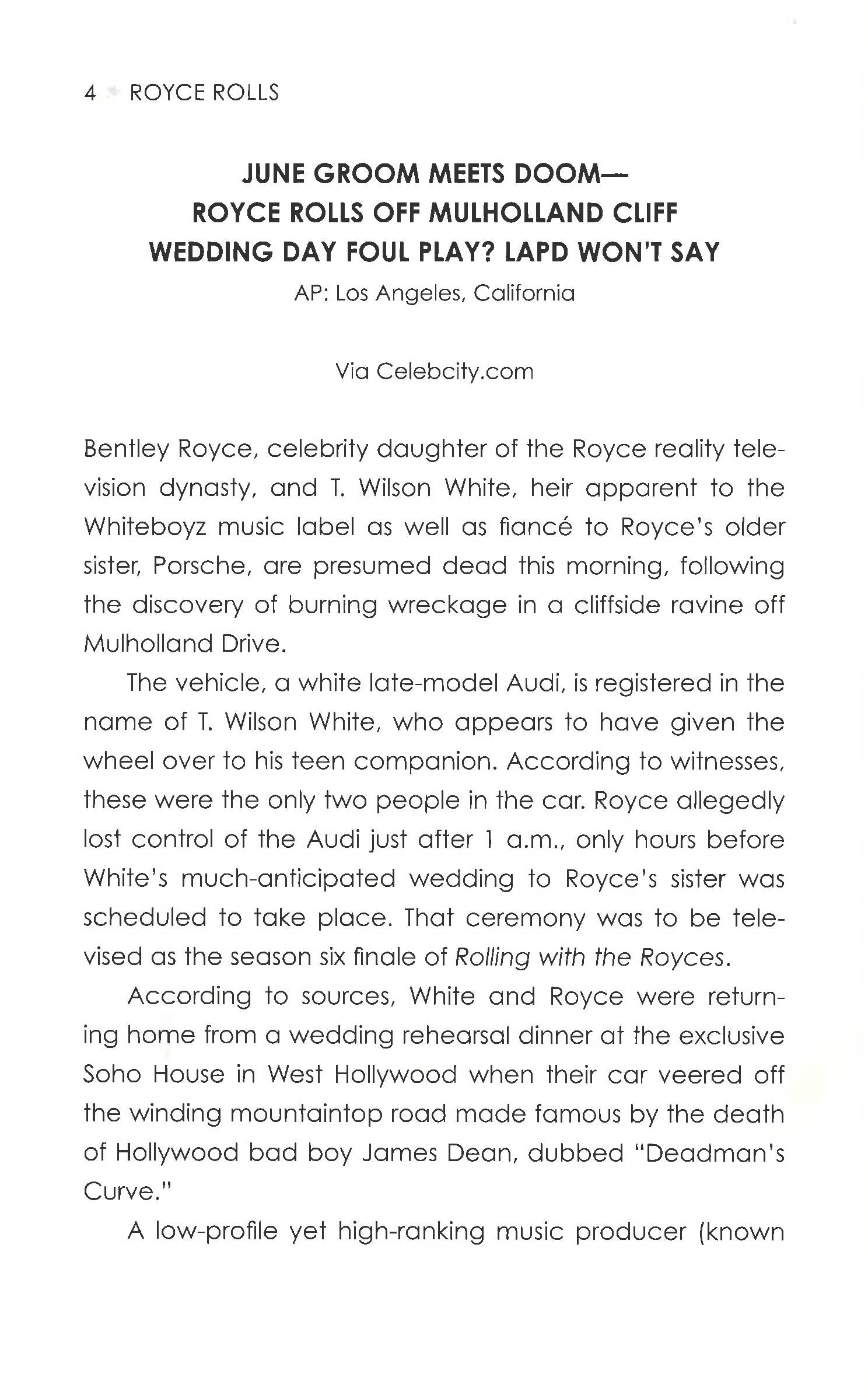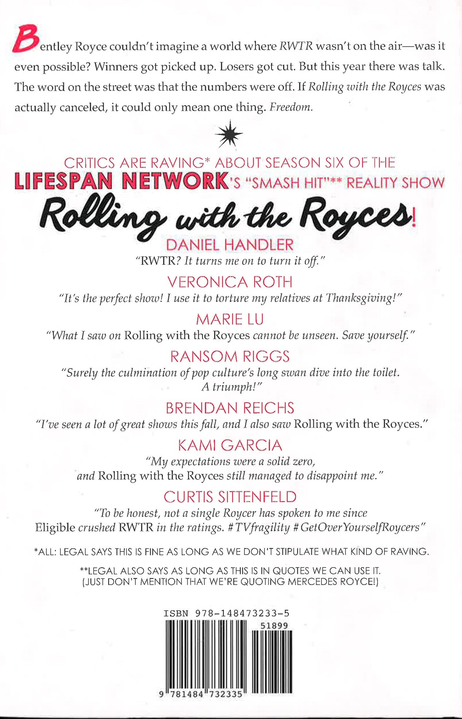 Sixteen-year-old Bentley Royce seems to have it all: an actual Bentley, tuition to a fancy private school, lavish vacations, and everything else that comes along with being an LA starlet. But after five seasons on her family's reality show, Rolling with the Royces, and a lifetime of dealing with her narcissistic sister, Porsche, media-obsessed mother, Mercedes, and somewhat clueless brother, Maybach, Bentley wants out. Luckily for her, without a hook for season six, cancellation is looming and freedom is nigh. With their lifestyle on the brink, however, Bentley's family starts to crumble, and one thing becomes startlingly clear - without the show, there is no family. And since Bentley loves her family, she has to do the unthinkable - save the show. But when her future brother-in-law's car goes over a cliff with both Bentley and her sister's fiancé inside - on the day of the big made-for-TV wedding, no less - things get real.Really real. Like, not reality show real.Told in a tongue-in-cheek voice that takes a swipe at all things Hollywood, Royce Rolls is a laugh-out-loud funny romp with an LA noir twist about what it means to grow up with the cameras rolling and what really happens behind the scenes.