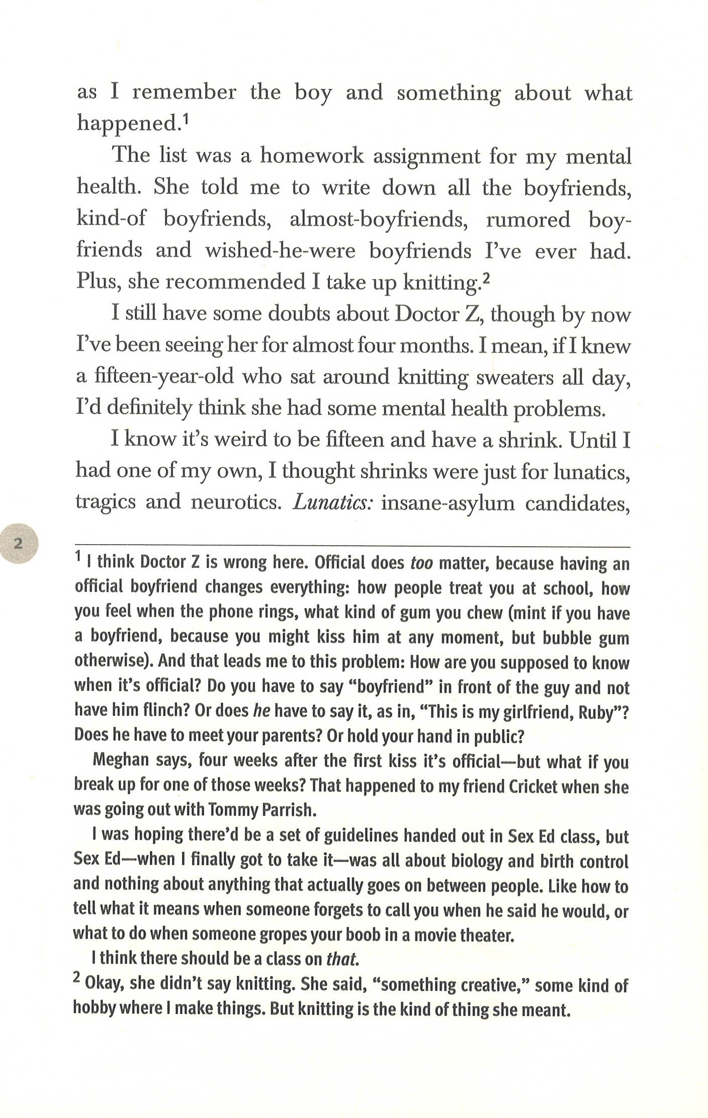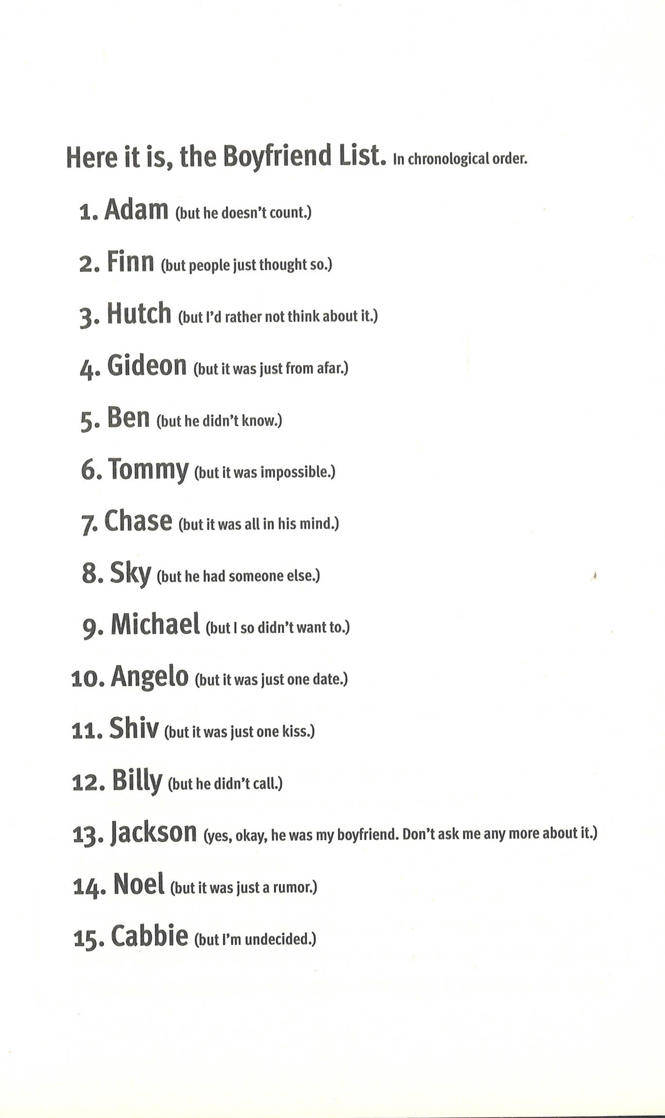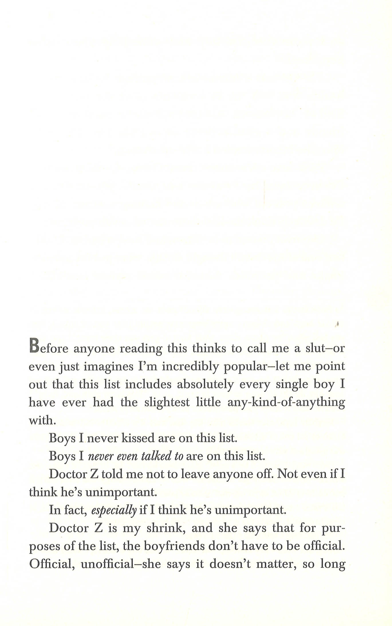 Oliver is fifteen and has a shrink. But before you make up your mind about her, you should know that she has had a pretty awful (and eventful) past ten days. She has: lost her boyfriend, lost her best friend,lost all her other friends, did something suspicious with a boy, did something advanced with a boy, had an argument with a boy, drank her first beer (someone handed it to her), got caught by her mom, had a panic attack, lost a lacrosse game, failed a math test, hurt Meghan's feelings, became a social outcast, and had graffiti written about her in the girls' bathroom. But don't worry, Ruby lives to tell the tale. Through a special assignment to list all the boys she's ever had the slightest, little, any-kind-of-anything with, comes an unfortunate series of events that would be enough to send any girl in a panic.