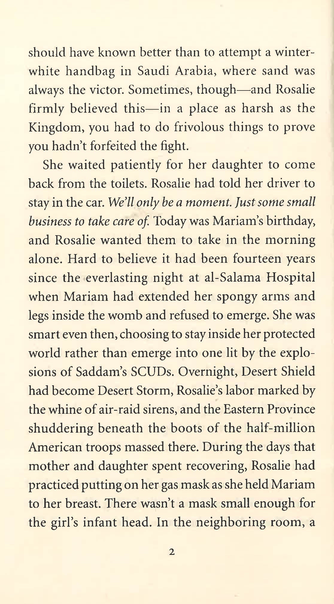 More than two decades after moving to Saudi Arabia and marrying Abdullah Baylani, Rosalie learns that her husband has taken a second wife, beautiful Palestinian Isra. The discovery plunges the powerful family into chaos as Rosalie grapples with leaving Saudi Arabia, her life, and her family behind. Driven by anger and heartache, she plots her departure, soliciting fellow American and Abdullah's best friend, lonely divorce Dan Coleman, to help her. Meanwhile, Abdullah and Rosalie's consuming personal entanglements blind them to the crisis approaching their sixteen-year-old son Faisal, whose deepening resentment towards their lifestyle has led to his growing involvement with a controversial Sheikh. When Faisal makes an ill-fated choice that could destroy everything his embattled family holds dear, all must confront difficult truths as they fight to preserve what remains of their love.
