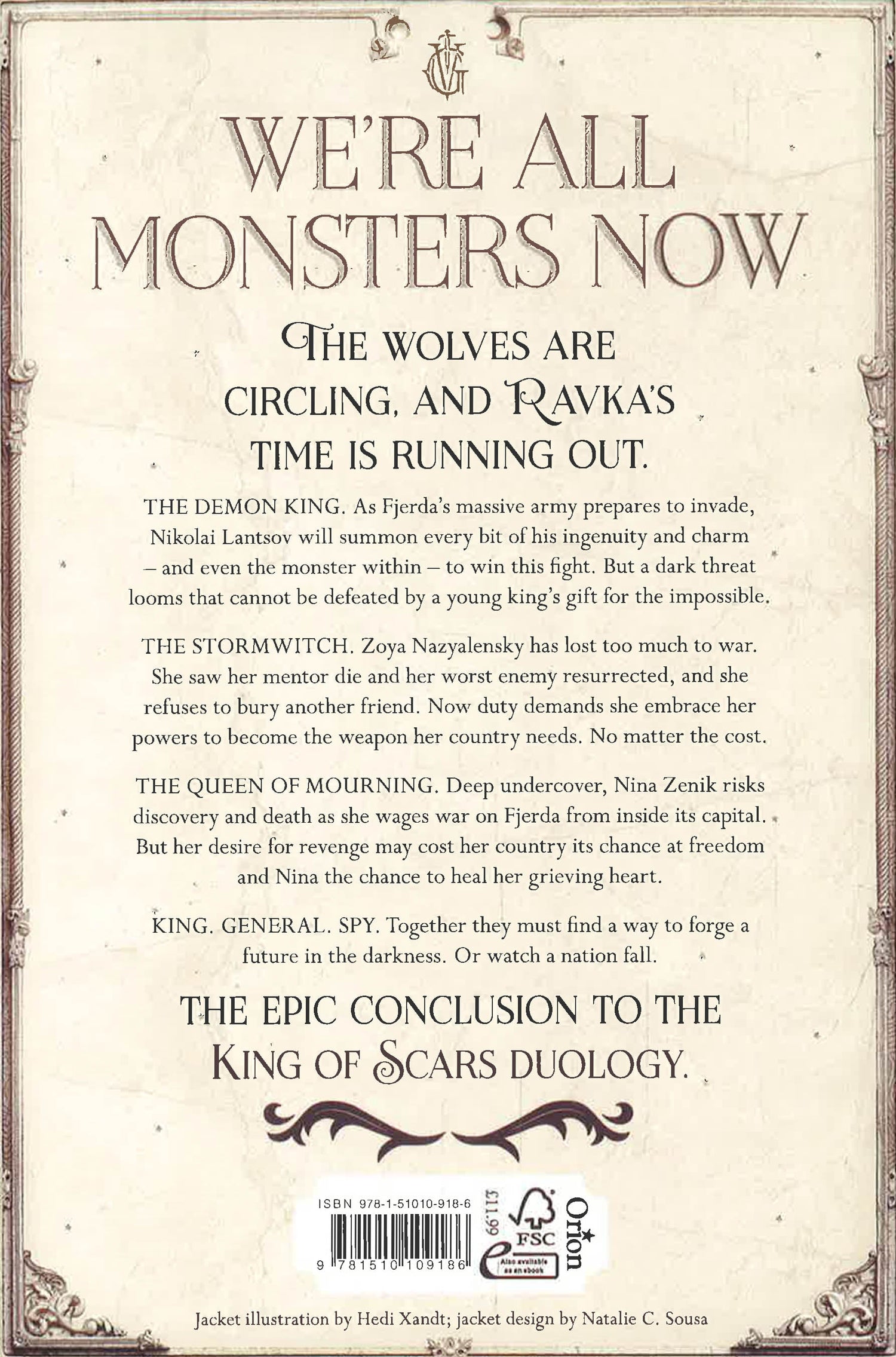 The Demon King. As Fjerda's massive army prepares to invade, Nikolai Lantsov will summon every bit of his ingenuity and charm - and even the monster within - to win this fight. But a dark threat looms that cannot be defeated by a young king's gift for the impossible.