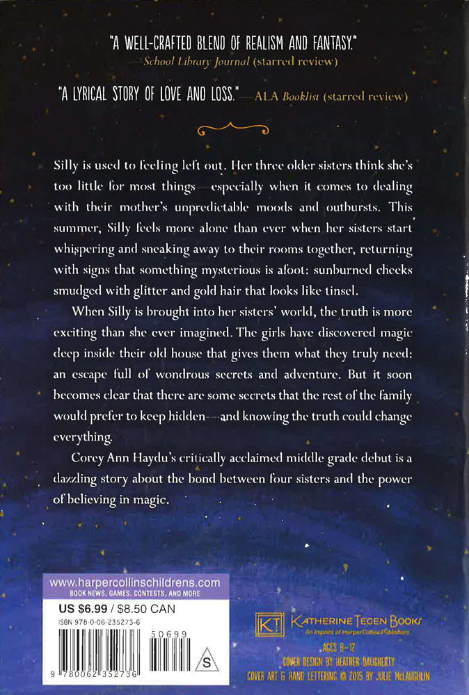 In the tradition of Sharon Creech and Wendy Mass, Corey Ann Haydu's sparkling middle grade debut is a sister story with a twist of magic, a swirl of darkness, and a whole lot of hope. Silly is used to feeling left out. Her three older sisters think she's too little for most things-especially when it comes to dealing with their mother's unpredictable moods and outbursts. This summer, Silly feels more alone than ever when her sisters keep whispering and sneaking away to their rooms together, returning with signs that something mysterious is afoot: sporting sunburned cheeks smudged with glitter and gold hair that looks like tinsel. When Silly is brought into her sisters' world, the truth is more exciting than she ever imagined. The sisters have discovered a magical place that gives them what they truly need: an escape from the complications of their home life. But there are dark truths there, too. Silly hopes the magic will be the secret to saving their family, but she's soon forced to wonder if it could tear them apart.