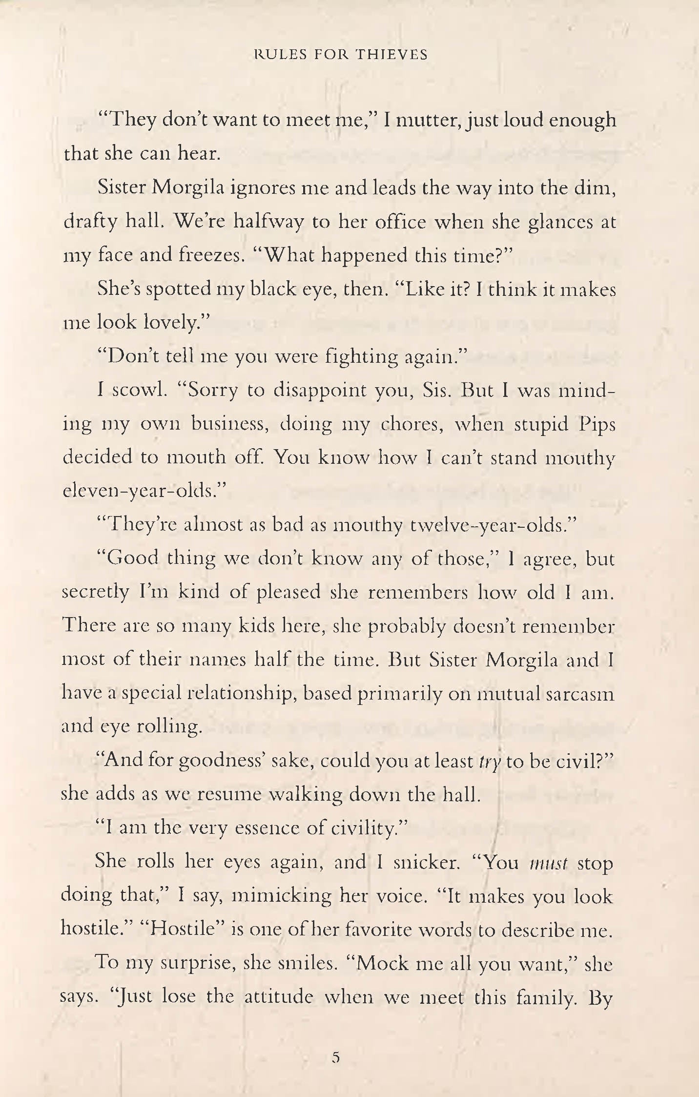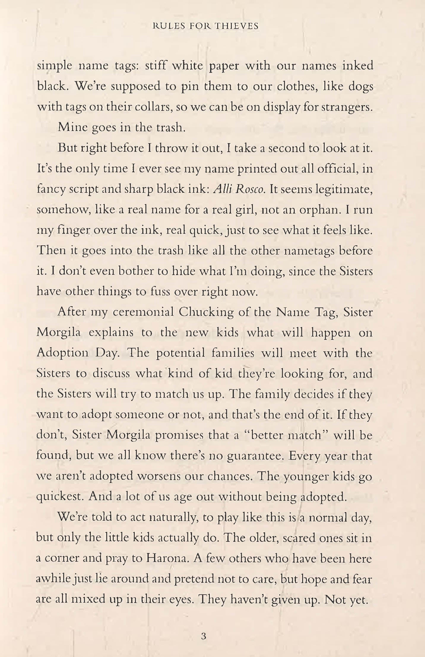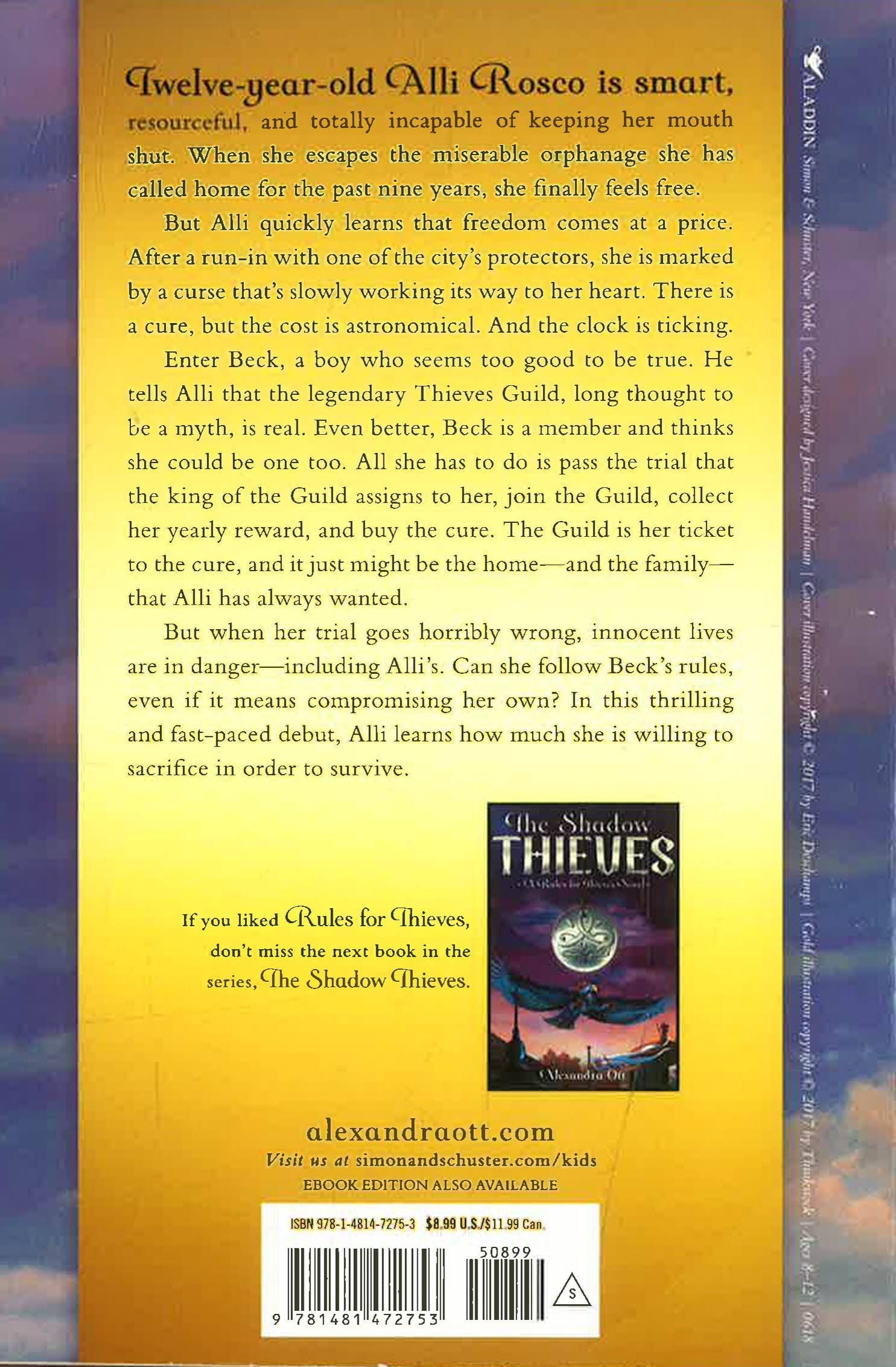 After twelve-year-old orphan, Alli Rosco, is cursed with a deadly spell, she must join the legendary Thieves Guild in order to try and save herself in this high-stakes debut. Twelve-year-old Alli Rosco is smart, resourceful, and totally incapable of keeping her mouth shut. Some of these traits have served her well during her nine years in Azeland's orphanage, and others have proved more troublesome...but now that she's escaped to try her luck on the streets, she has bigger problems than extra chores to contend with. Surviving would be hard enough, but after a run-in with one of the city's Protectors, she's marked by a curse that's slowly working its way to her heart. There is a cure, but the cost is astronomical--and seems well out of her reach. Enter Beck, a boy with a gift for theft and a touch of magic, who seems almost too good to be true. He tells Alli that the legendary Thieves Guild, long thought to be a myth, is real. Even better, Beck is a member and thinks she could be, too. All she has to do is pass the trial that the King of Thieves will assign to her. Join the Guild, collect her yearly reward and buy a cure. Plus, Alli hopes the Guild will be the home--the family--that Alli has always wanted. But when their trial goes wrong, innocent lives are put in danger, and Alli has to decide how much she can sacrifice in order to survive.