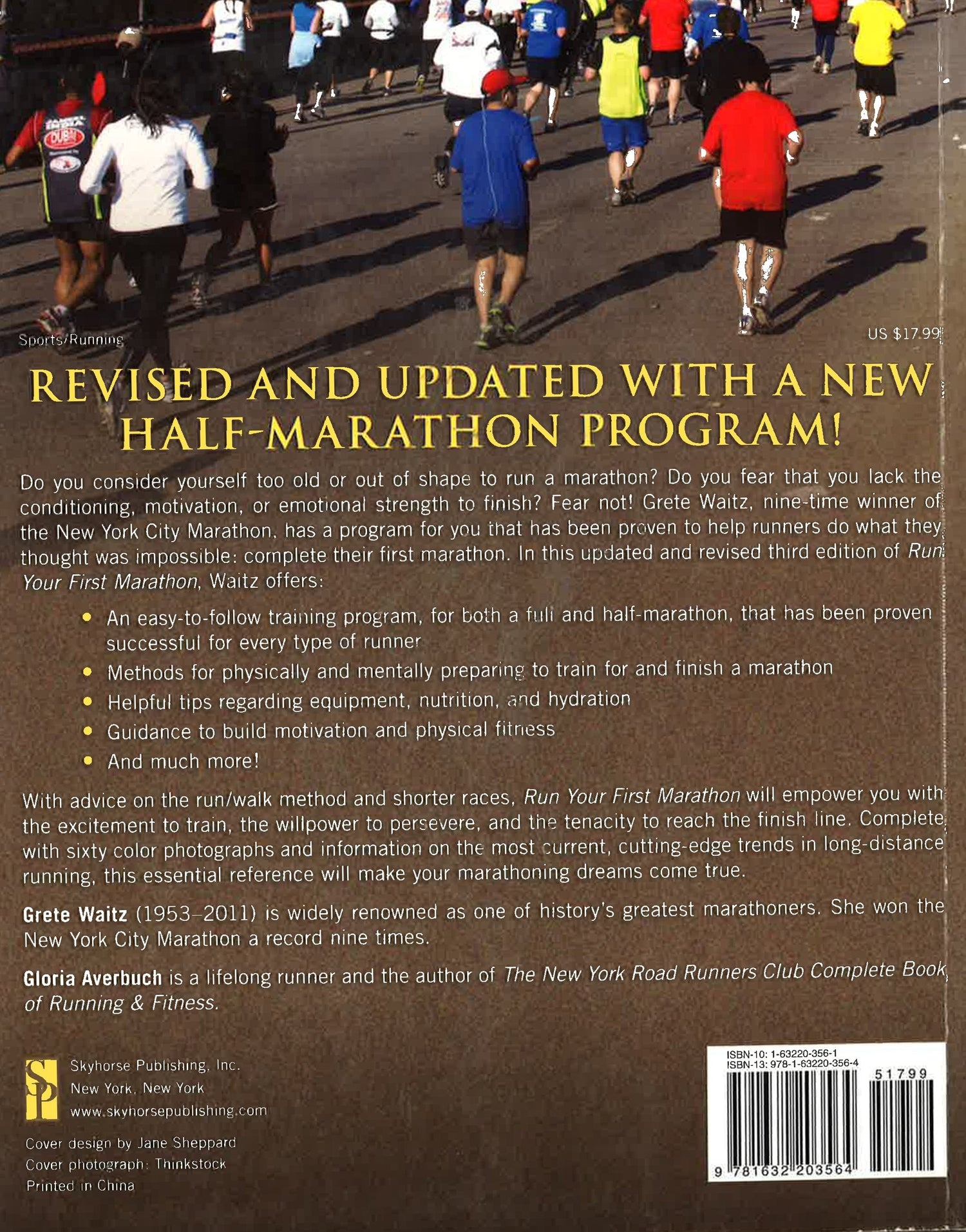 "Includes a half-marathon training program"--Cover. Do you consider yourself too old or out of shape to run a marathon? Do you fear that you lack the conditioning, motivation, or emotional strength to finish? If so, Grete Waitz, nine-time winner of the New York City Marathon, has a program for you that has proven to help would-be racers do what they thought was impossible: complete their first marathon. In this updated and revised third edition of Run Your First Marathon, Waitz offers: A sixteen-week training program that has been proven successful time and time again Methods for physically and mentally preparing to start and finish a marathon Helpful tips regarding equipment, nutrition, and hydration Guidance to help overcome motivational and physical roadblocks And much more!With advice on 10Ks and other shorter races, Run Your First Marathon will empower runners with the courage to train, the willpower to persevere, and the tenacity to reach the finish line. Complete with sixty color photographs and information on the most current, cutting-edge trends in long-distance running, this essential reference will make your marathoning dreams come true.