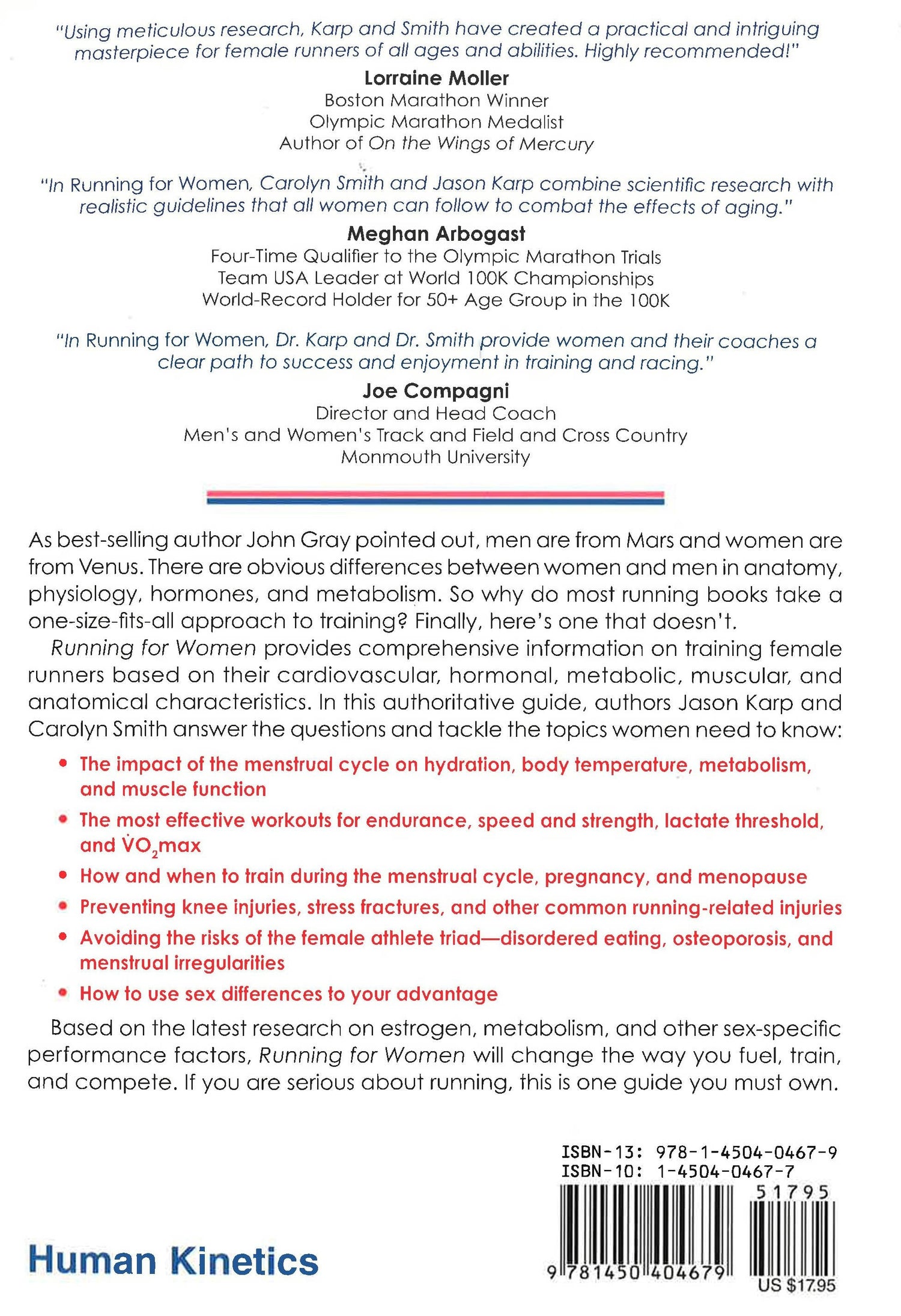As best-selling author John Gray pointed out, men are from Mars and women are from Venus. There are obvious differences between women and men in anatomy, physiology, hormones, and metabolism. So why do most running books take a one-size-fits-all approach to training? Finally, here's one that doesn't. Running for Women provides comprehensive information on training female runners based on their cardiovascular, hormonal, metabolic, muscular, and anatomical characteristics. In this authoritative guide, authors Jason Karp and Carolyn Smith answer the questions and tackle the topics women need to know: * The impact of the menstrual cycle on hydration, body temperature, metabolism, and muscle function * The most effective workouts for endurance, speed and strength, lactate threshold, and VO2max * How and when to train during the menstrual cycle, pregnancy, and menopause * Preventing knee injuries, stress fractures, and other common running-related injuries * Avoiding the risks of the female athlete triad-disordered eating, osteoporosis, and menstrual irregularitie * How to use sex differences to your advantage Based on the latest research on estrogen, metabolism, and other sex-specific performance factors, Running for Women will change the way you fuel, train, and compete. If you are serious about running, this is one guide you must own.