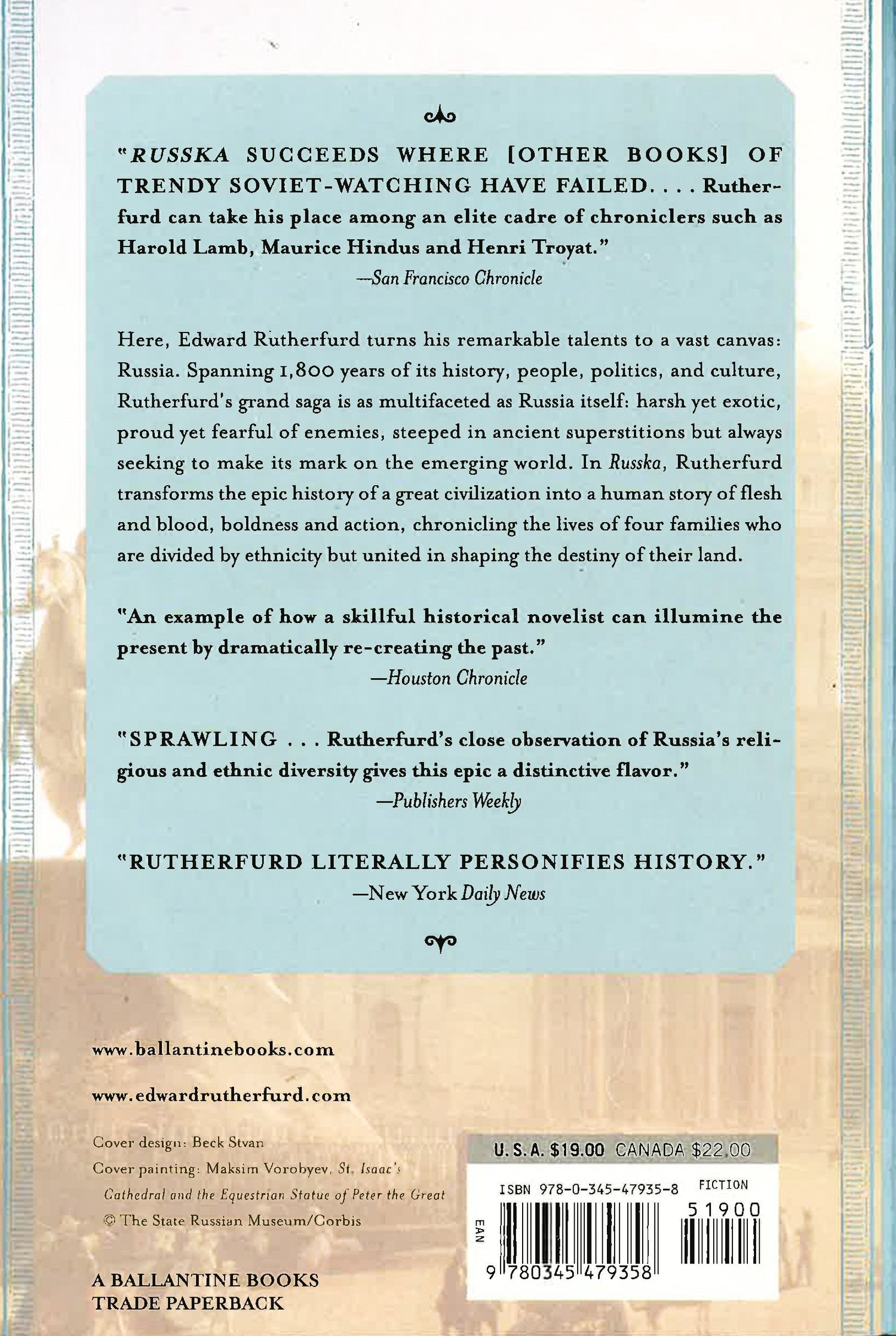 Impressive." THE WASHINGTON POST BOOK WORLD Spanning 1800 years of Russia's history, people, poltics, and culture, Edward Rurtherford, author of the phenomenally successful SARUM: THE NOVEL OF ENGLAND, tells a grand saga that is as multifaceted as Russia itself. Here is a story of a great civilization made human, played out through the lives of four families who are divided by ethnicity but united in shaping the destiny of their land. "Rutherford's RUSSKA succeeds....He can take his place among an elite cadre of chroniclers such as Harold Lamb, Maurice Hindus and Henri Troyat. *This book may have remainder mark and minor shelfwear.
