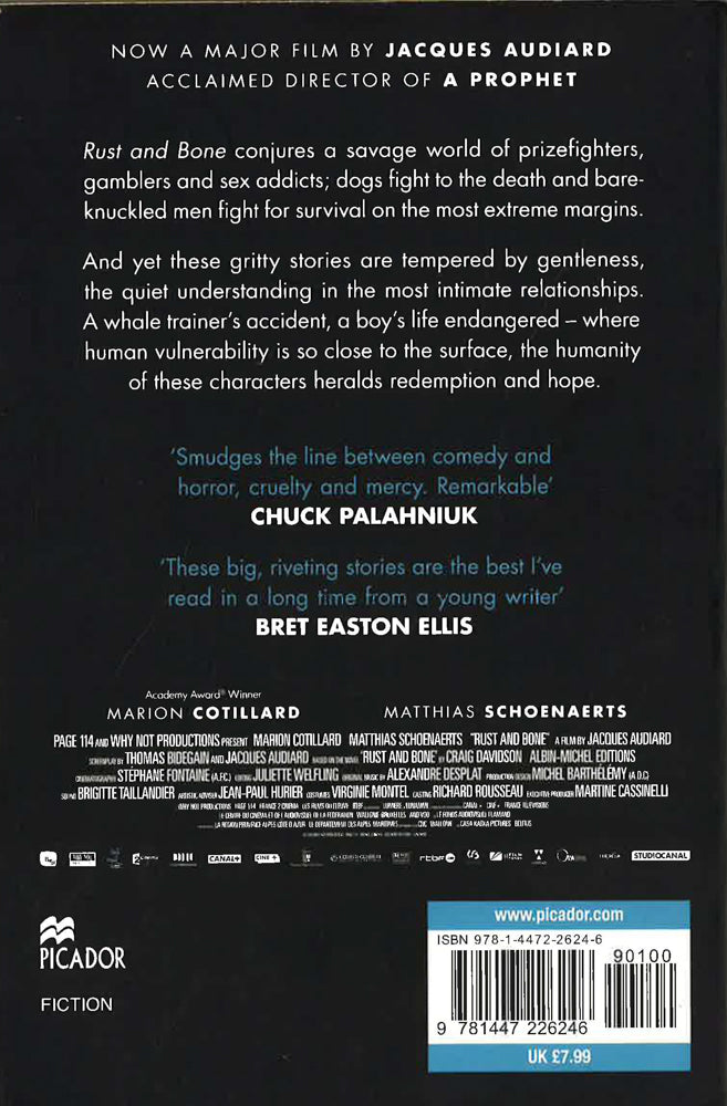 Now a film by Jacques Audiard starring Marion Cotillard Rust and Bone conjures a savage world of prizefighters, gamblers and sex addicts; dogs fight to the death and bare-knuckled men fight for survival on the most extreme margins. And yet these gritty stories are tempered by gentleness, the quiet understanding in the most intimate relationships. A whale trainer's accident, a boy's life endangered - where human vulnerability is so close to the surface, the humanity of these characters heralds redemption and hope.
