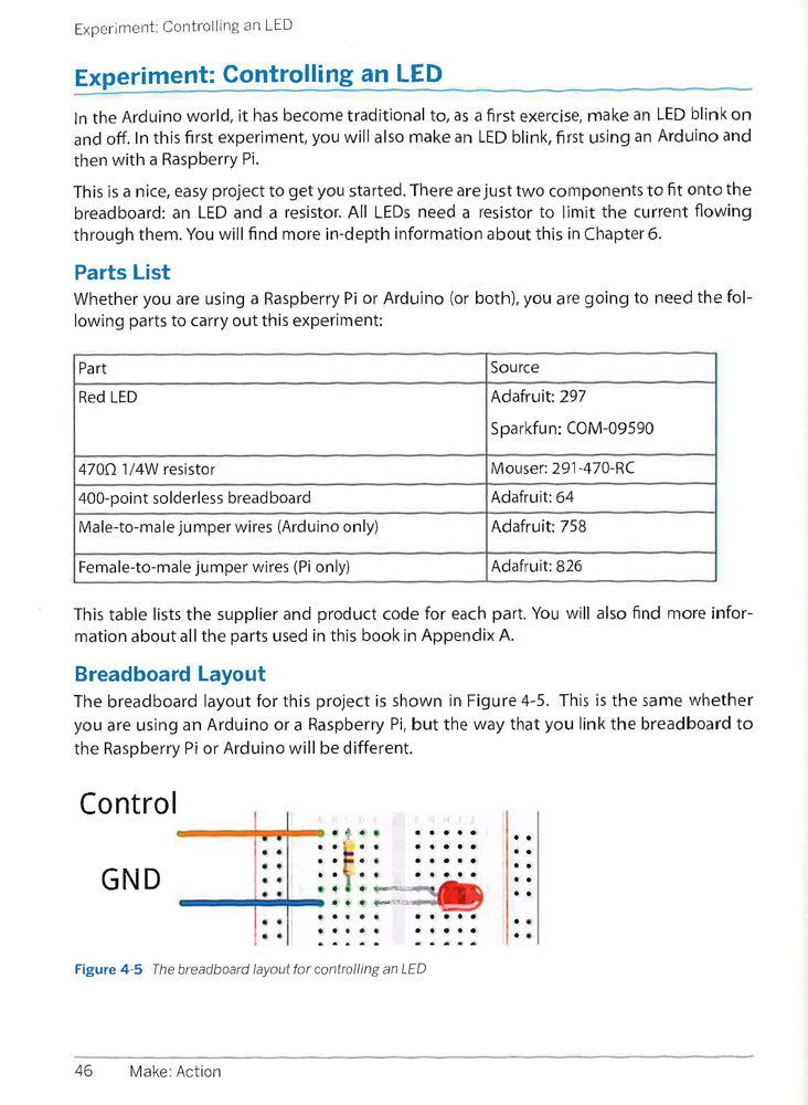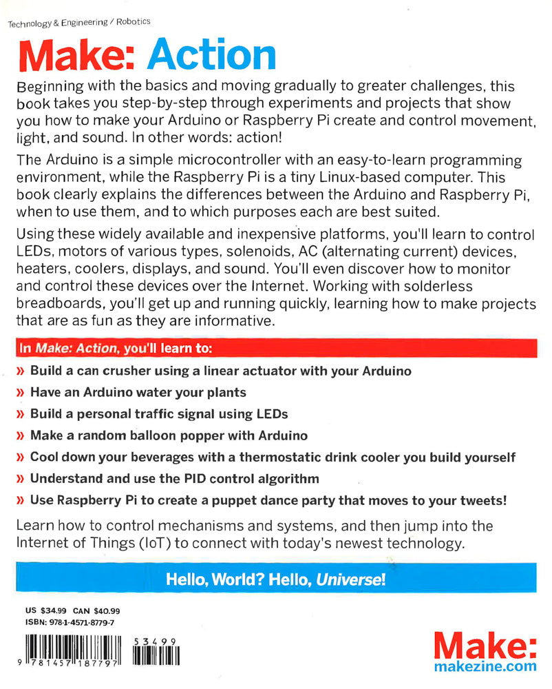 Beginning with the basics and moving gradually to greater challenges, this book takes you step-by-step through experiments and projects that show you how to make your Arduino or Raspberry Pi create and control movement, light, and sound. In other words: action! The Arduino is a simple microcontroller with an easy-to-learn programming environment, while the Raspberry Pi is a tiny Linux-based computer. This book clearly explains the differences between the Arduino and Raspberry Pi, when to use them, and to which purposes each are best suited. Using these widely available and inexpensive platforms, you'll learn to control LEDs, motors of various types, solenoids, AC (alternating current) devices, heaters, coolers, displays, and sound. You'll even discover how to monitor and control these devices over the Internet. Working with solderless breadboards, you'll get up and running quickly, learning how to make projects that are as fun as they are informative. In Make: Action, you'll learn to: Build a can crusher using a linear actuator with your Arduino Have an Arduino water your plants Build a personal traffic signal using LEDs Make a random balloon popper with Arduino Cool down your beverages with a thermostatic drink cooler you build yourself Understand and use the PID control algorithm Use Raspberry Pi to create a puppet dance party that moves to your tweets!