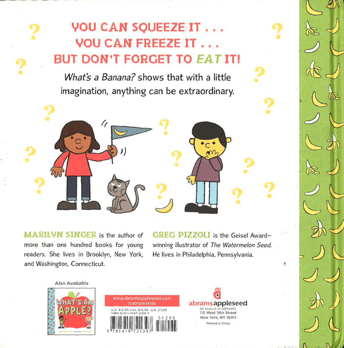 Bestselling author of the Tallulah's Tutu series, Marilyn Singer, and Geisel Award-winning illustrator Greg Pizzoli team up to launch a delicious new seriesWhat can you do with a banana? You can grip it, unzip it, squeeze it, freeze it-you can even play it like a flute! With a little imagination and a sense of humour, you can transform it into anything! Turn the ordinary into the extraordinary with these charming picture books that encourage readers to use their imagination to look at the world in a new-more magical-way.