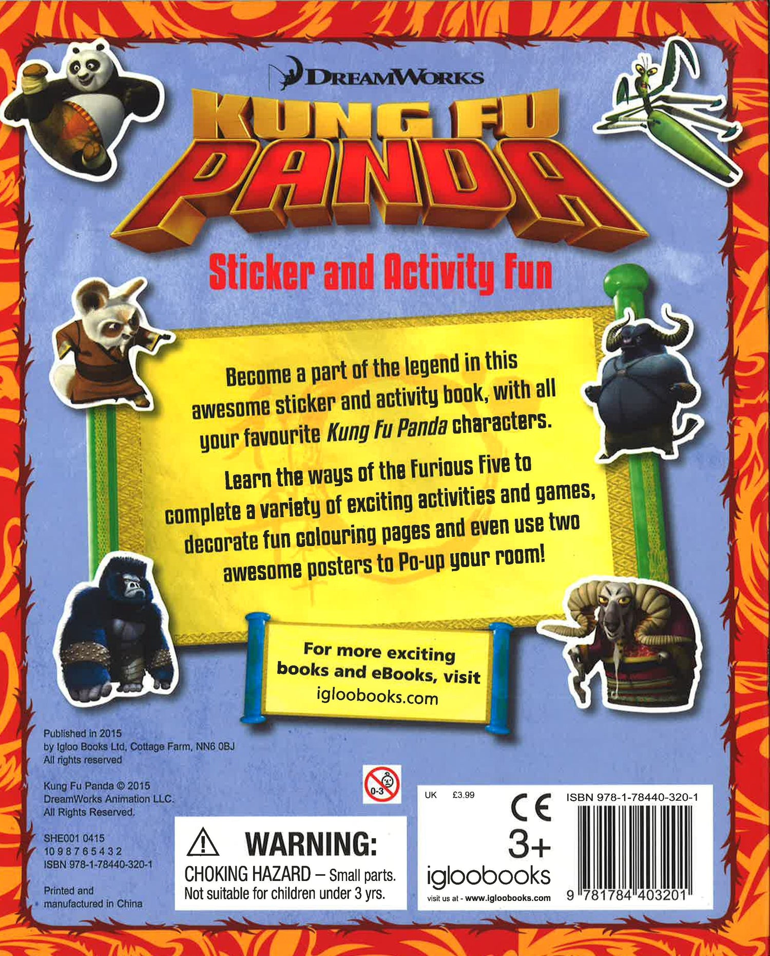 Become a part of the legend in this awesome sticker and activity book, with all your favourite Kung Fu Panda characters. Learn the ways of the Furious Five to complete a variety of exciting activities and games, decorate fun colouring pages and even use two awesome posters to Po-up your room!