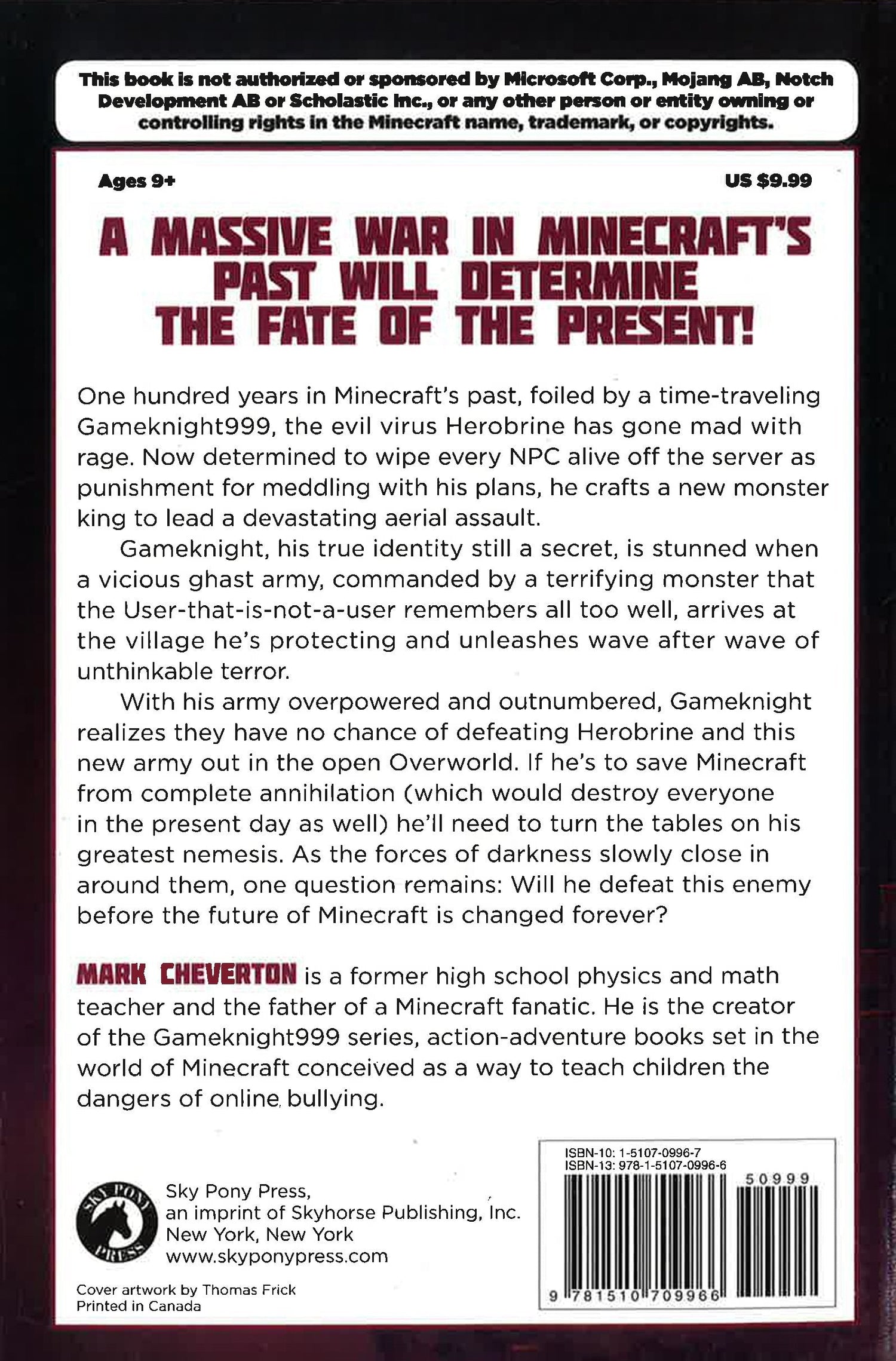 A massive war in Minecraft’s past will determine the fate of the present!One hundred years in Minecraft’s past, foiled by a time-traveling Gameknight999, the evil virus Herobrine has gone mad with rage. Now determined to wipe every NPC alive off the server as punishment for meddling with his plans, he crafts a new monster king to lead a devastating aerial assault.Gameknight, his true identity still a secret, is stunned when a vicious ghast army, commanded by a terrifying monster that the User-that-is-not-a-user remembers all too well, arrives at the village he’s protecting and unleashes wave after wave of unthinkable terror.With his army overpowered and outnumbered, Gameknight realizes they have no chance of defeating Herobrine and this new army out in the open Overworld. If he’s to save Minecraft from complete annihilation (which would destroy everyone in the present day as well) he’ll need to turn the tables on his greatest nemesis. As the forces of darkness slowly close in around them, one question remains: Will he defeat this enemy before the future of Minecraft is changed forever?This adventure series is created especially for readers who love the fight of good vs. evil, magical academies like Hogwarts in the Harry Potter saga, and games like Minecraft, Terraria, and Pokemon GO.