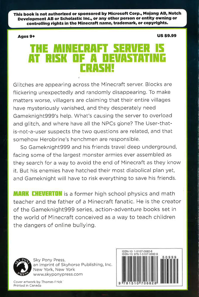 The Minecraft server is at risk of a devastating crash! Glitches are appearing across the Minecraft server. Blocks are flickering unexpectedly and randomly disappearing. To make matters worse, villagers are claiming that their entire villages have mysteriously vanished, and they desperately need Gameknight999’s help. What’s causing the server to overload and glitch, and where have all the NPCs gone? The User-that-is-not-a-user suspects the two questions are related, and that somehow Herobrine’s henchmen are responsible. So Gameknight999 and his friends travel deep underground, facing some of the largest monster armies ever assembled as they search for a way to avoid the end of Minecraft as they know it. But his enemies have hatched their most diabolical plan yet, and Gameknight will have to risk everything to save his friends.